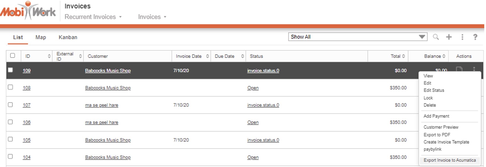 You can sync data from MobiWork to Acumatica, by marking the data you want to integrate in MobiWork; you can mark the selected data by right-clicking or clicking on the Individual Actions button and selecting the "Export... to Acumatica" option from the drop-down: