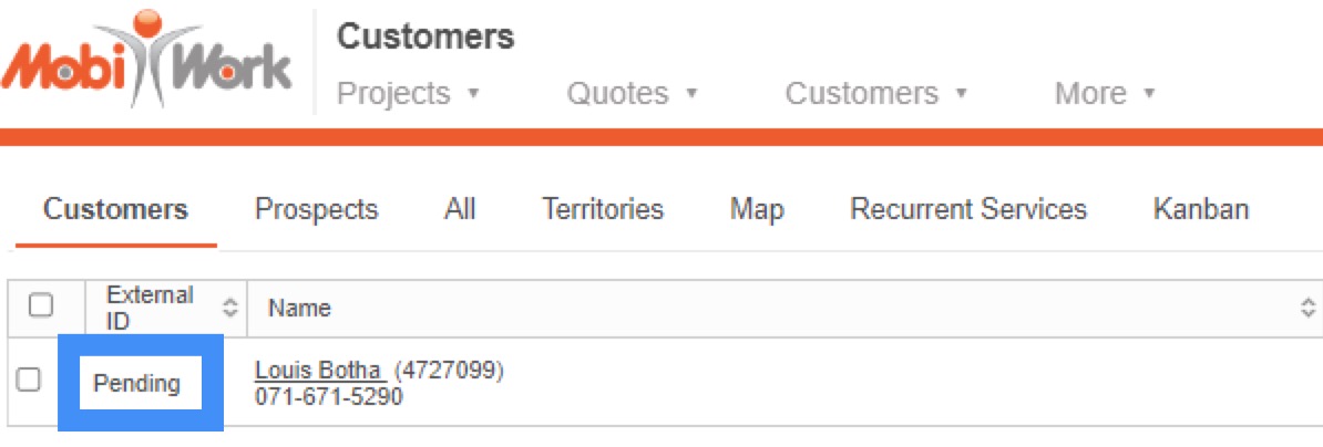 Once selected, the entity will be marked as "Ready" and the "External ID" column will have the "Pending" status. The actual sync will occur when you initiate the sync from Acumatica. Once the synchronization is performed, the "External ID" column will have the unique id of that entity in Acumatica. For more information on how to run the sync from Acumatica, please see the From Acumatica to MobiWork subsection: