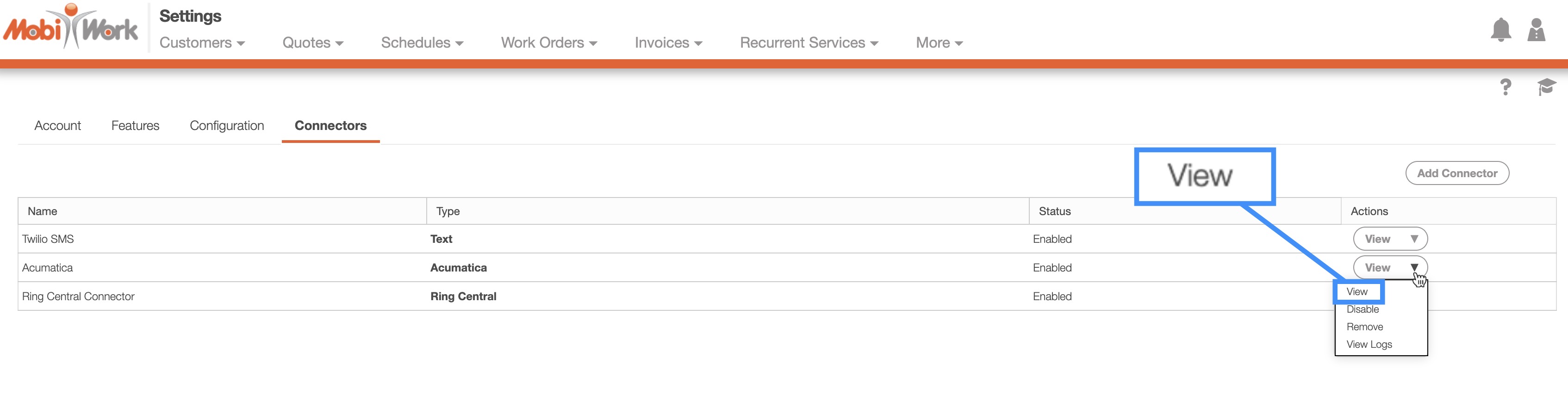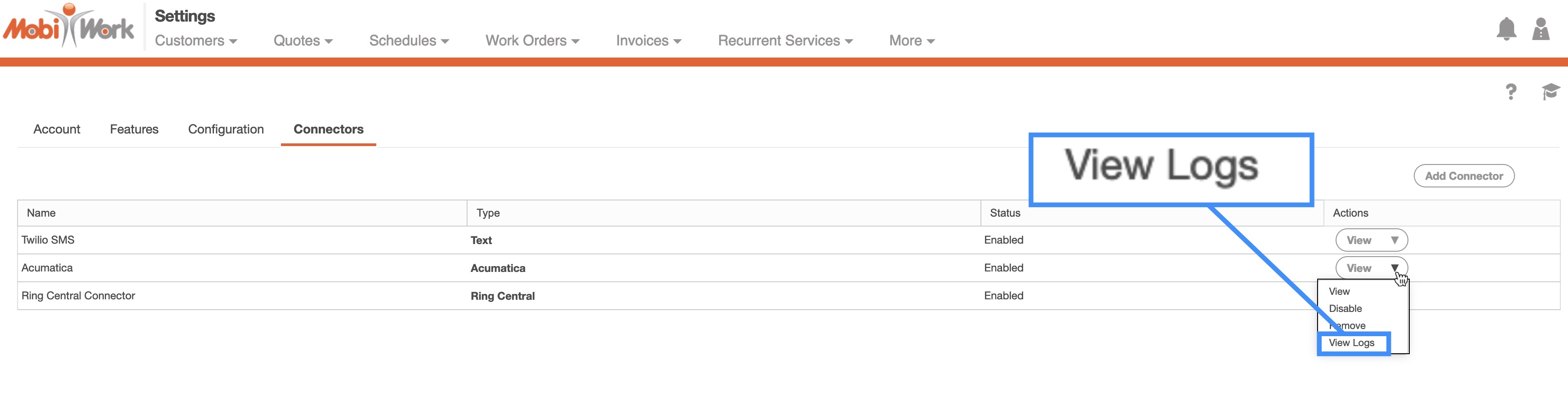 Each connector has detailed logs in MobiWork where you can view the summary of successful and failed records. The logs can be located by selecting the "View" option from your MobiWork Connector Settings page: