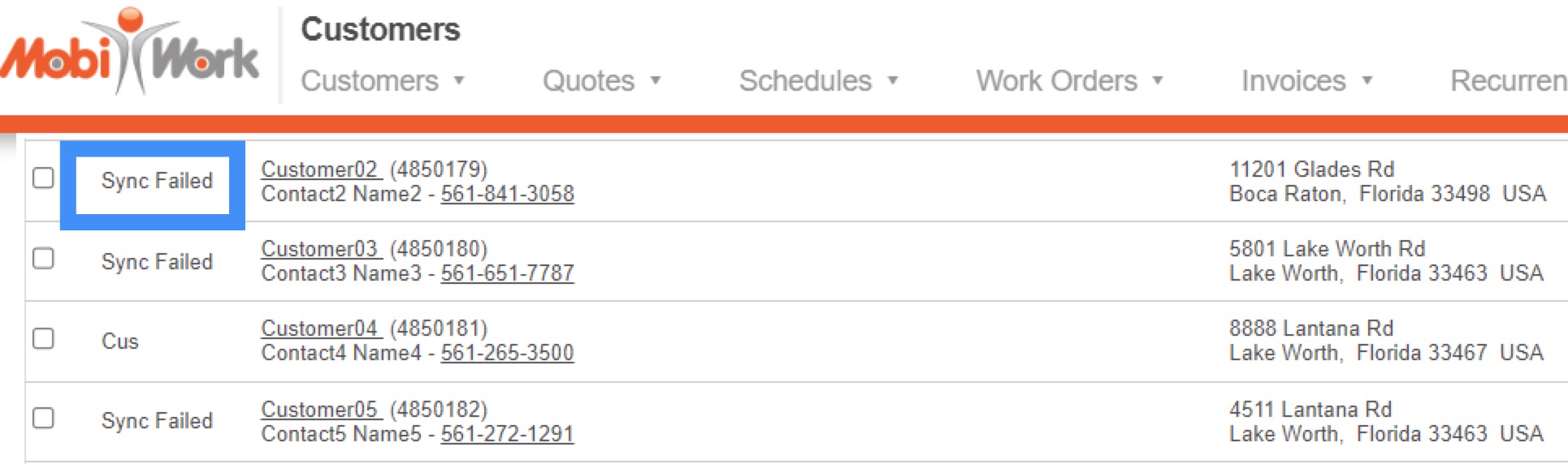 Once there is a failure, a note will be on the entity in MobiWork containing the error message. Failed records will also have the status, "Sync Failed" instead of "Pending." These records will continue to have the "Sync Failed" status until you mark them for export again: