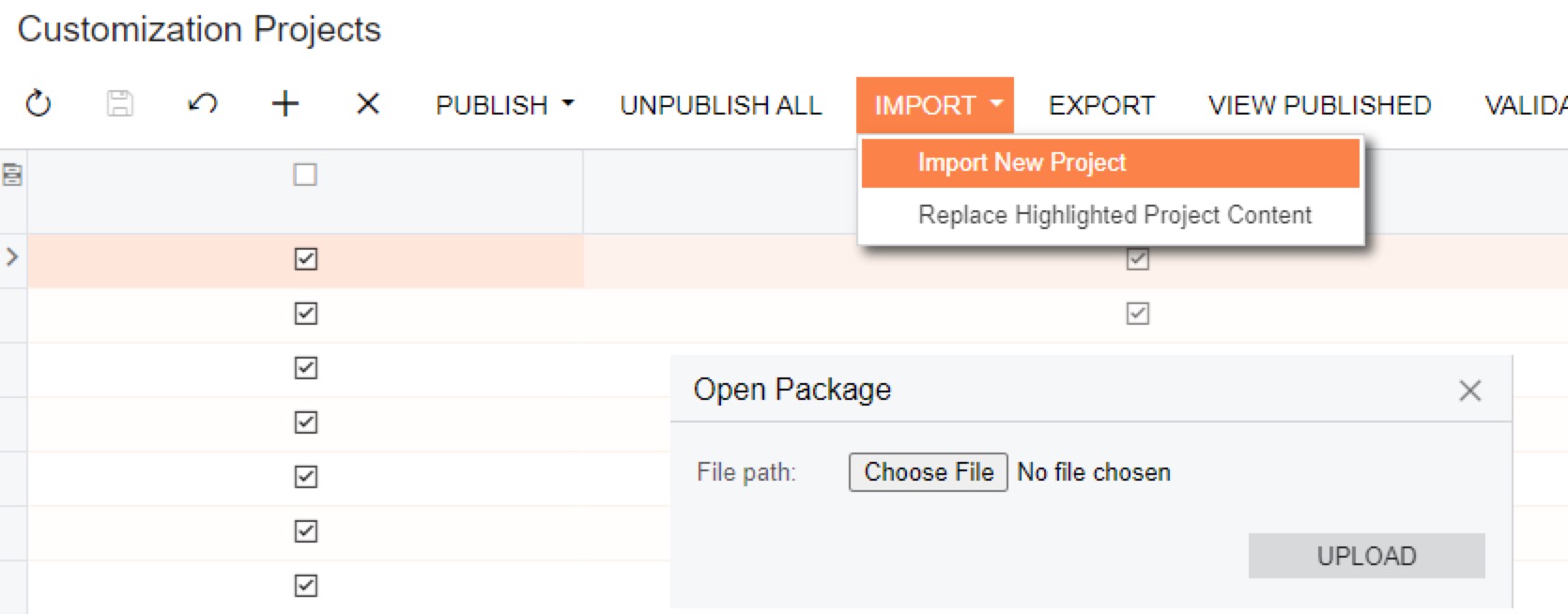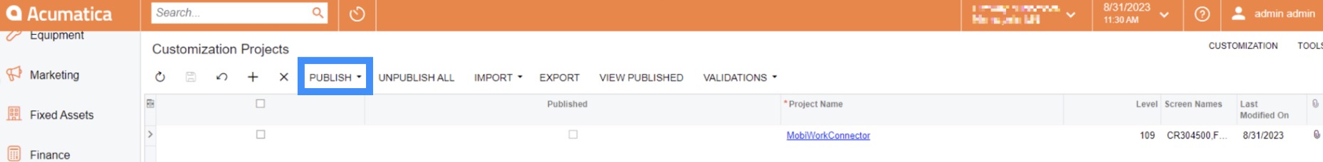 Upload the zipped Acumatica integration package onto the Customization Projects Screen page on Acumatica and then select the Publish action: