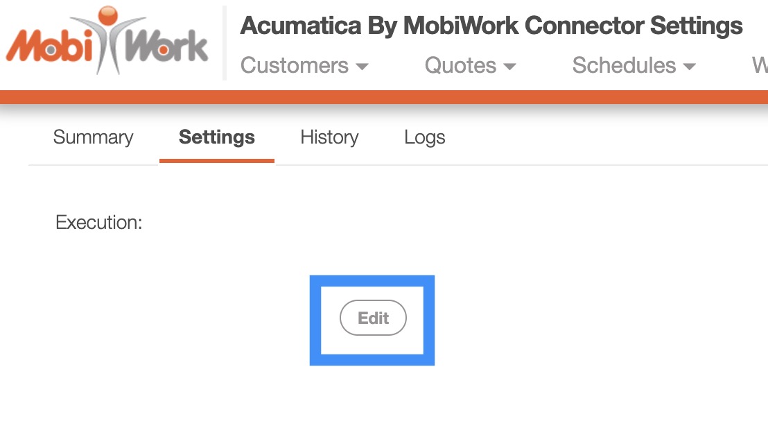 The "Execution Settings" section will allow you to modify how often your MobiWork and Acumatica data syncs and will also allow you to run a full system sync from MobiWork to Acumatica:
