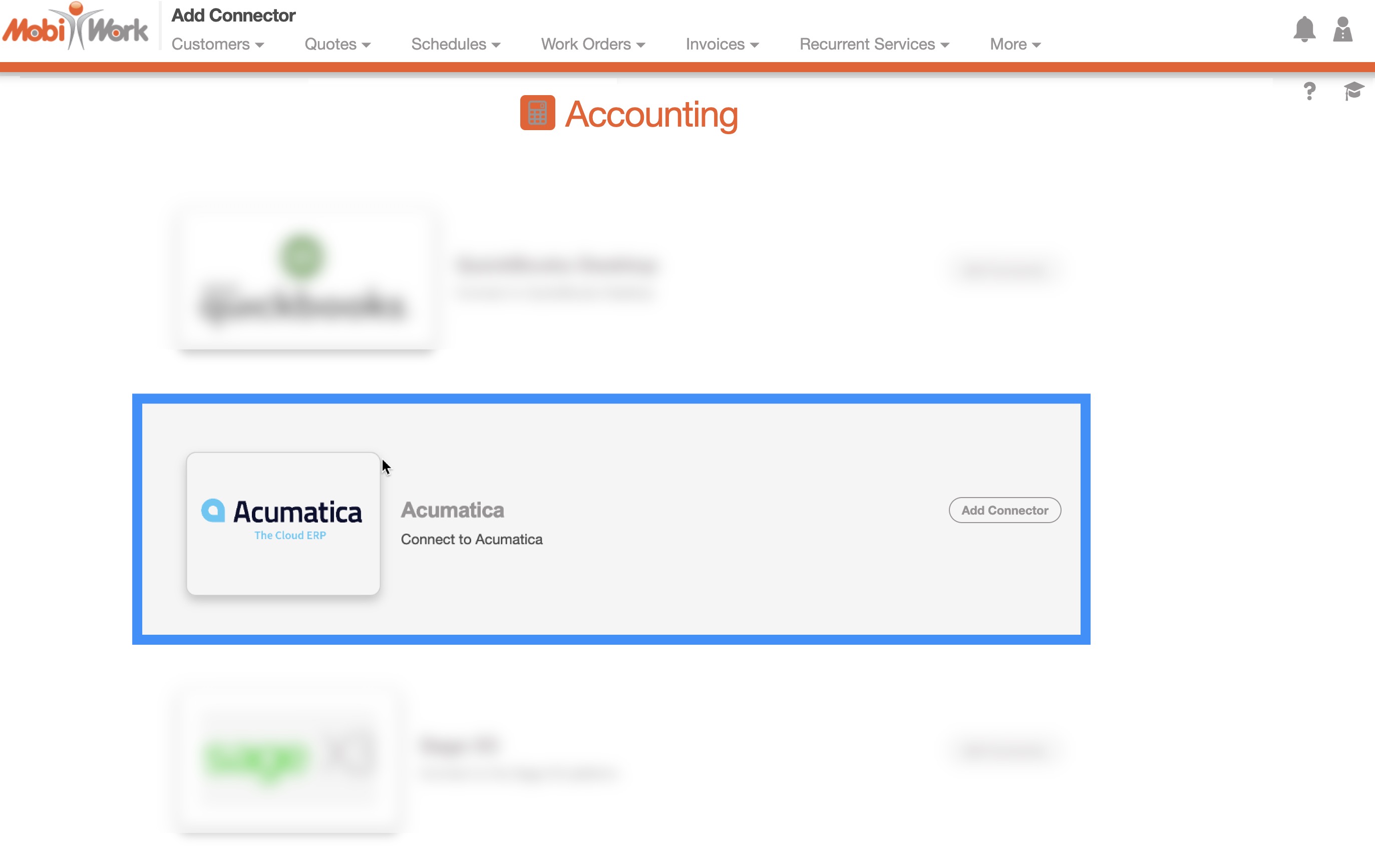 To install the Acumatica Connector onto MobiWork, you will first need to access the "Connectors" tab from the MobiWork Account Settings. For more information on how to access this page, please see the Account Settings Tab page.