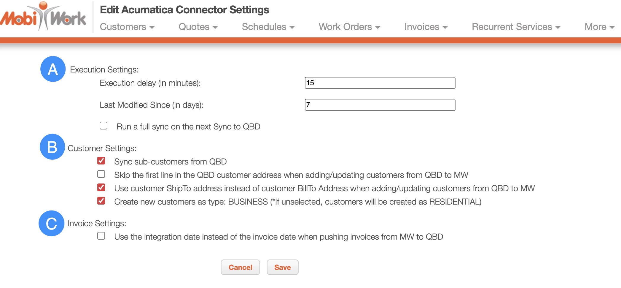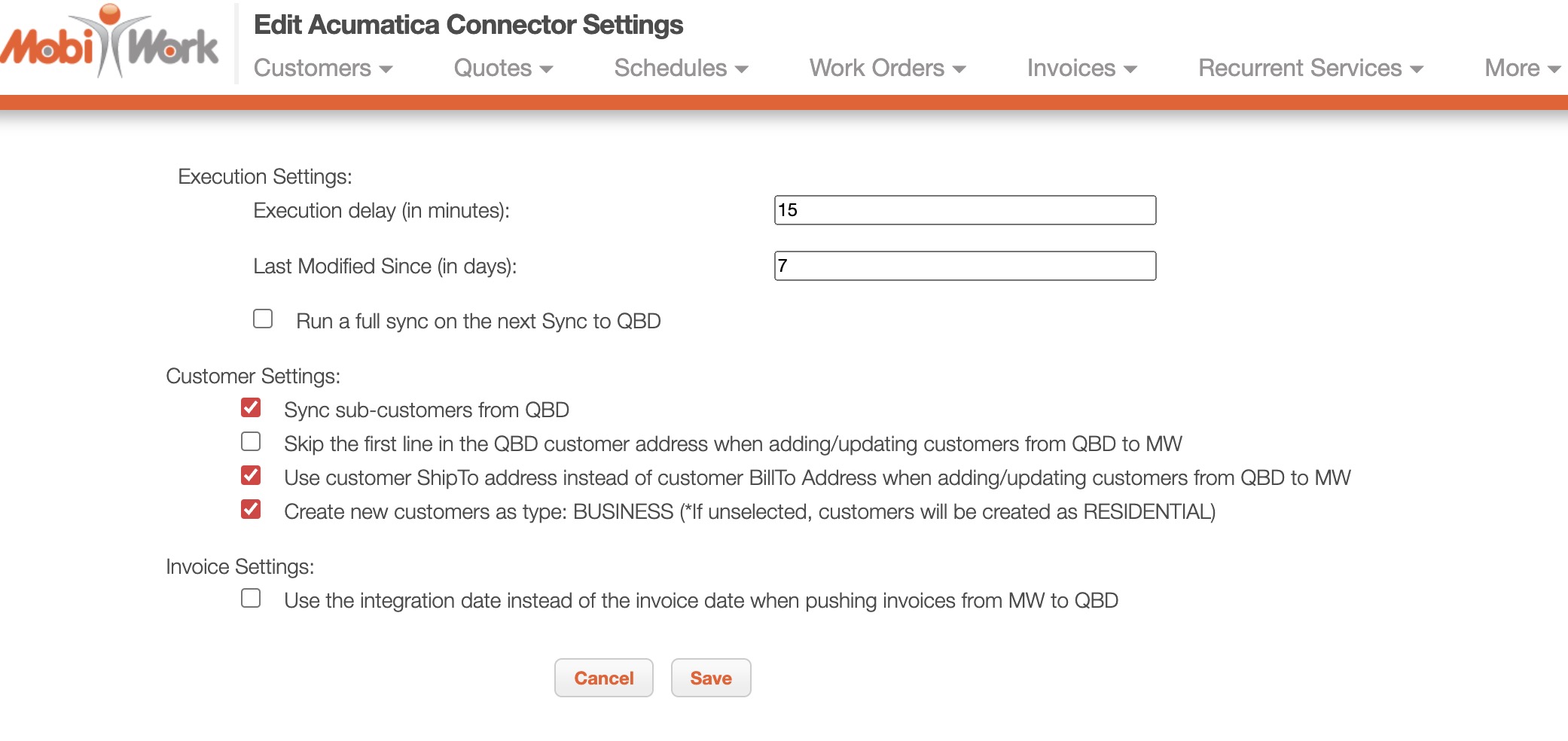 The settings for how Acumatica and MobiWork transfer and sync information are controlled within MobiWork.