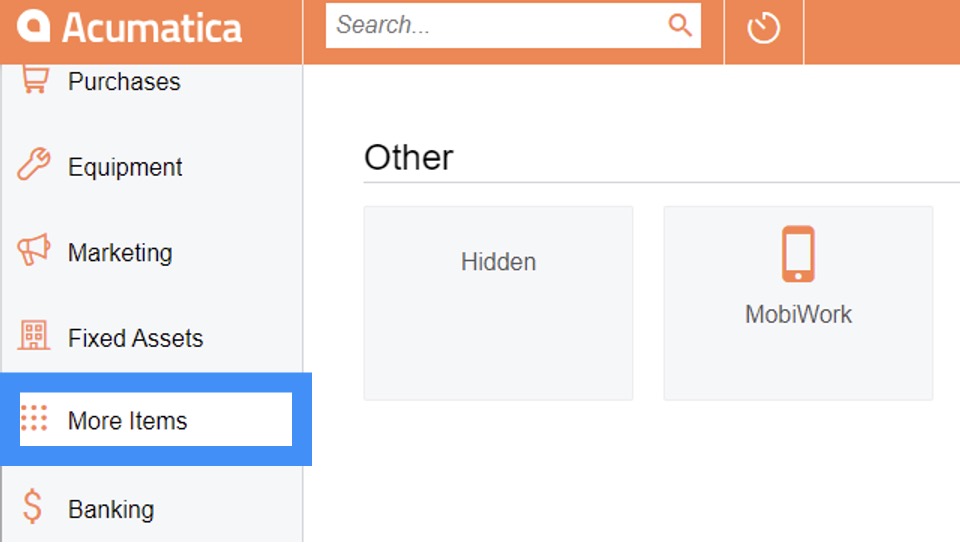 From Acumatica, select the More Items icon from your left-side menu. You will be directed to the Other page; from this page click on the MobiWork icon: