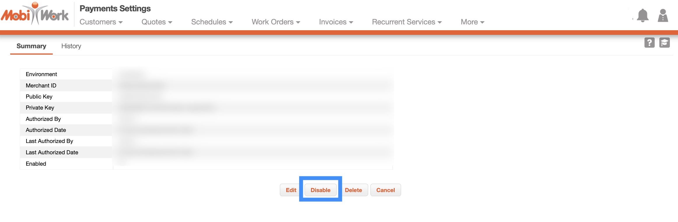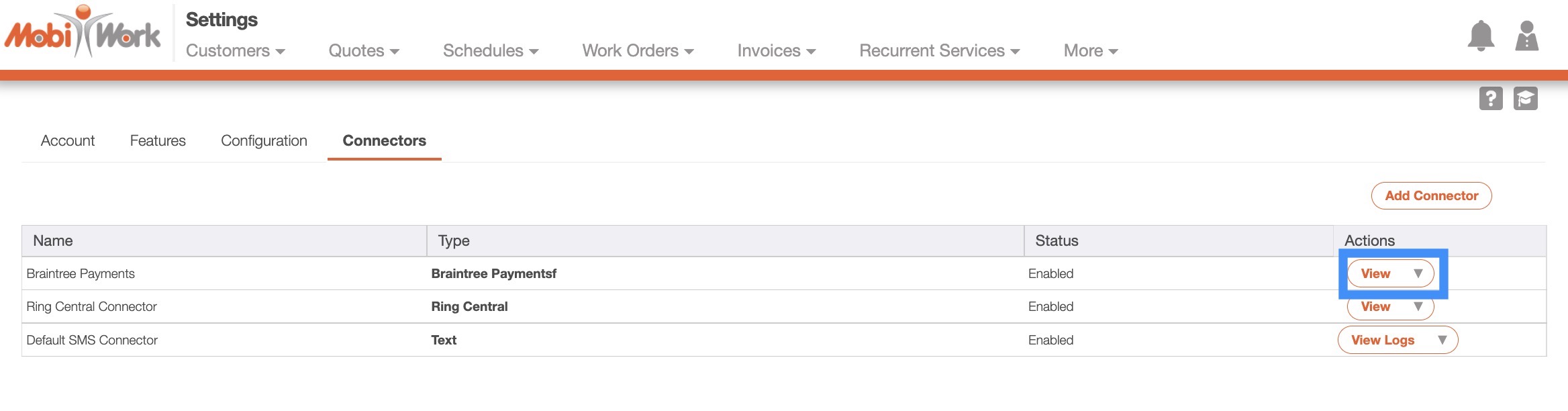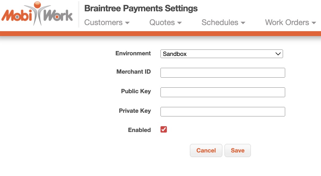 Also, please note that MobiWork only allows one payment connector per account. If your account already has another Payment Connector enabled, you must first disable it before setting up the Braintree Payments Connector.