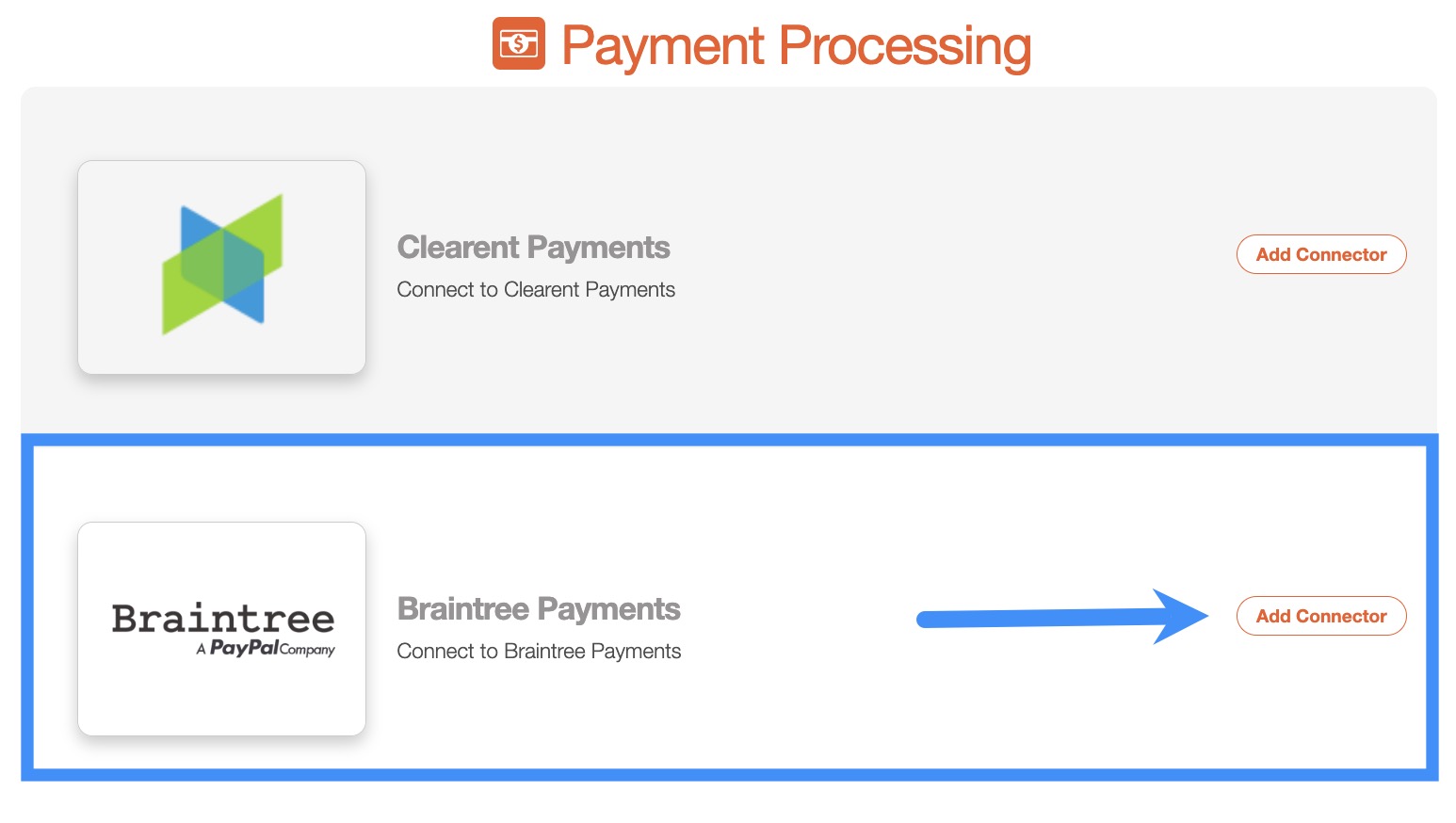Next, scroll down to the Payment Processing section, find Braintree Payments listed and click Add Connector: