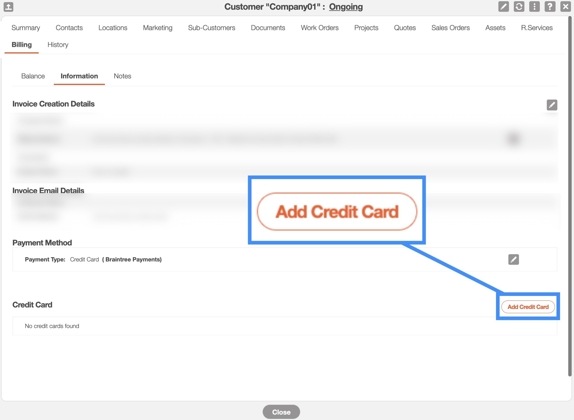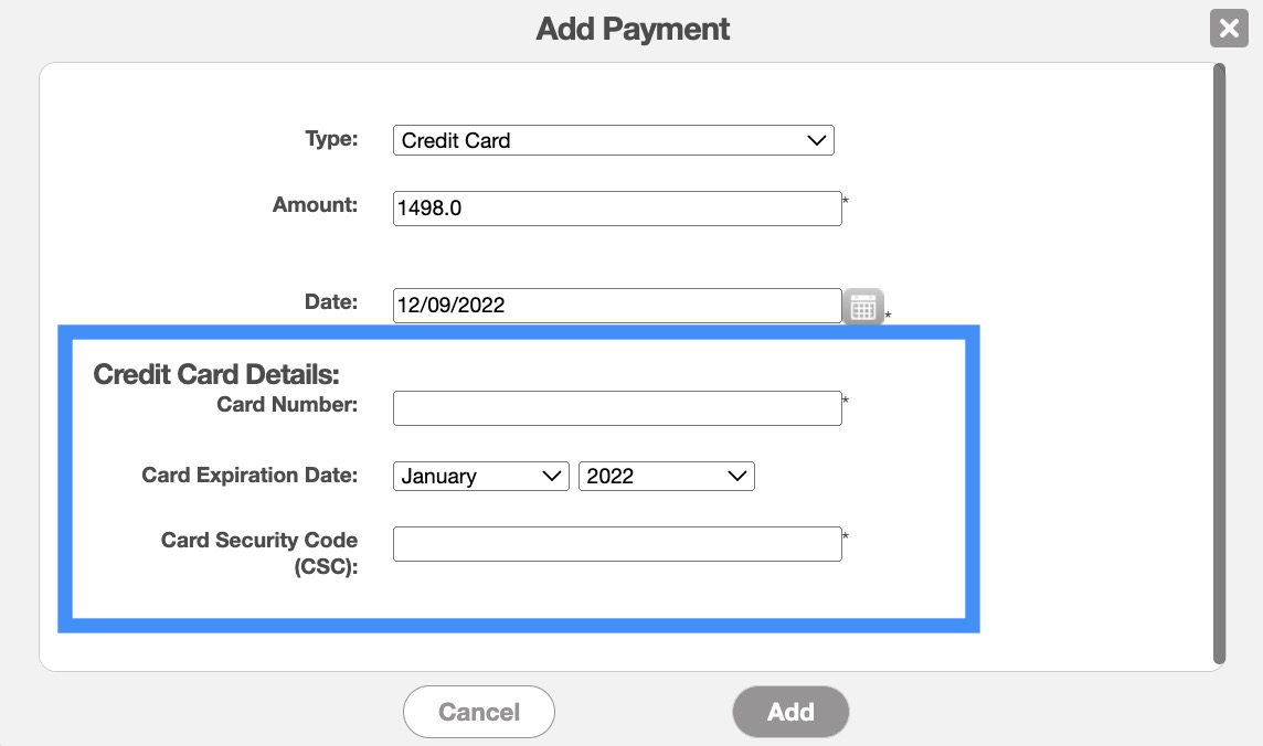 Note: The ability to store a customer's credit card data for future use, is only available to Global Admin users, or Users with permission to Edit Customer Billing. If you do not see the option to add a card to a customer account, please contact your company Admin(s).