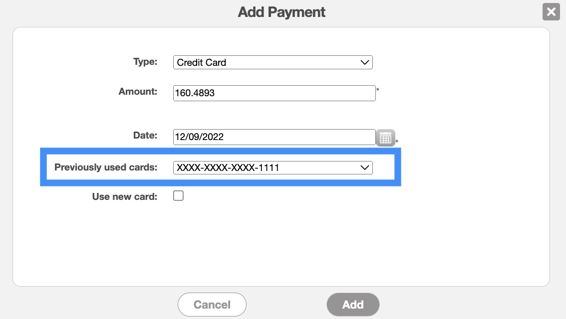 The next time you access the Add Payment pop-up window, you will be able to select the stored credit card information.