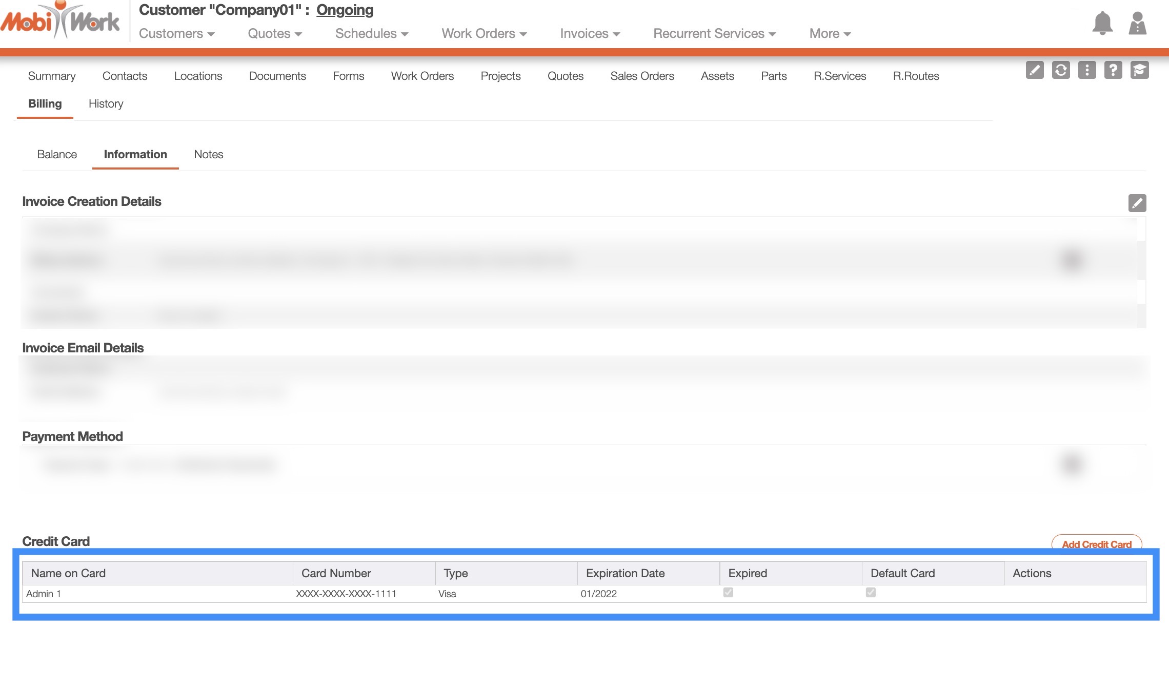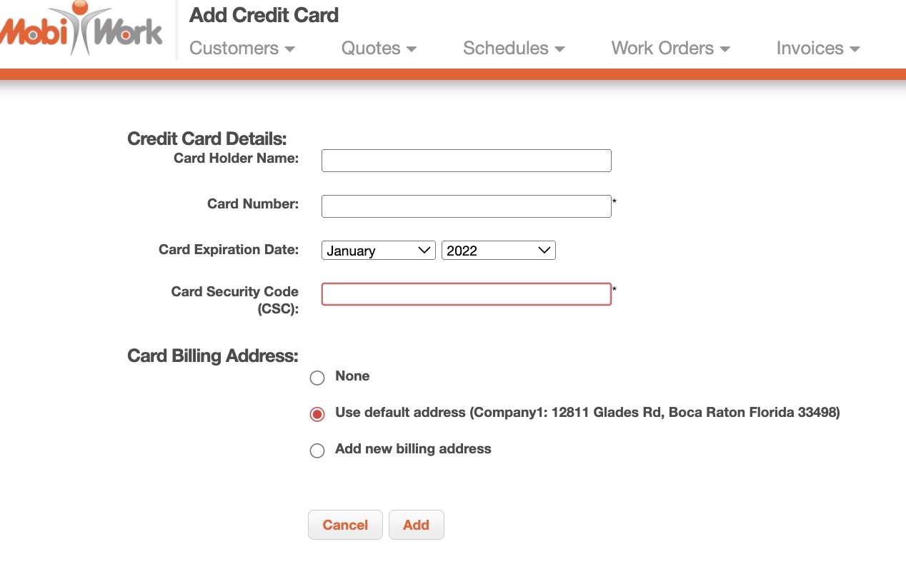 Within the MobiWork web application, you will be able to save credit card information for future payments. This information is added to the customer's file for later use.