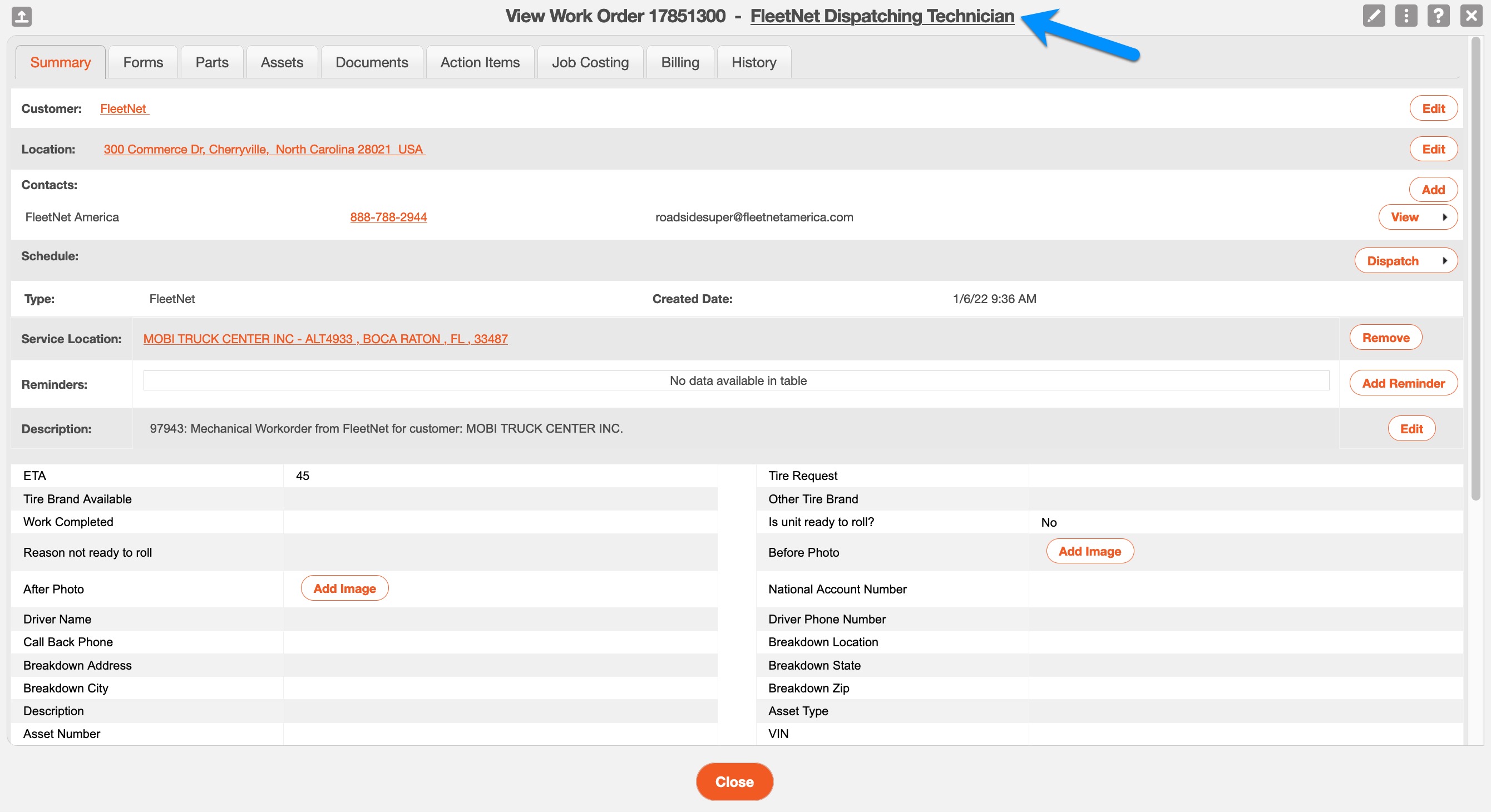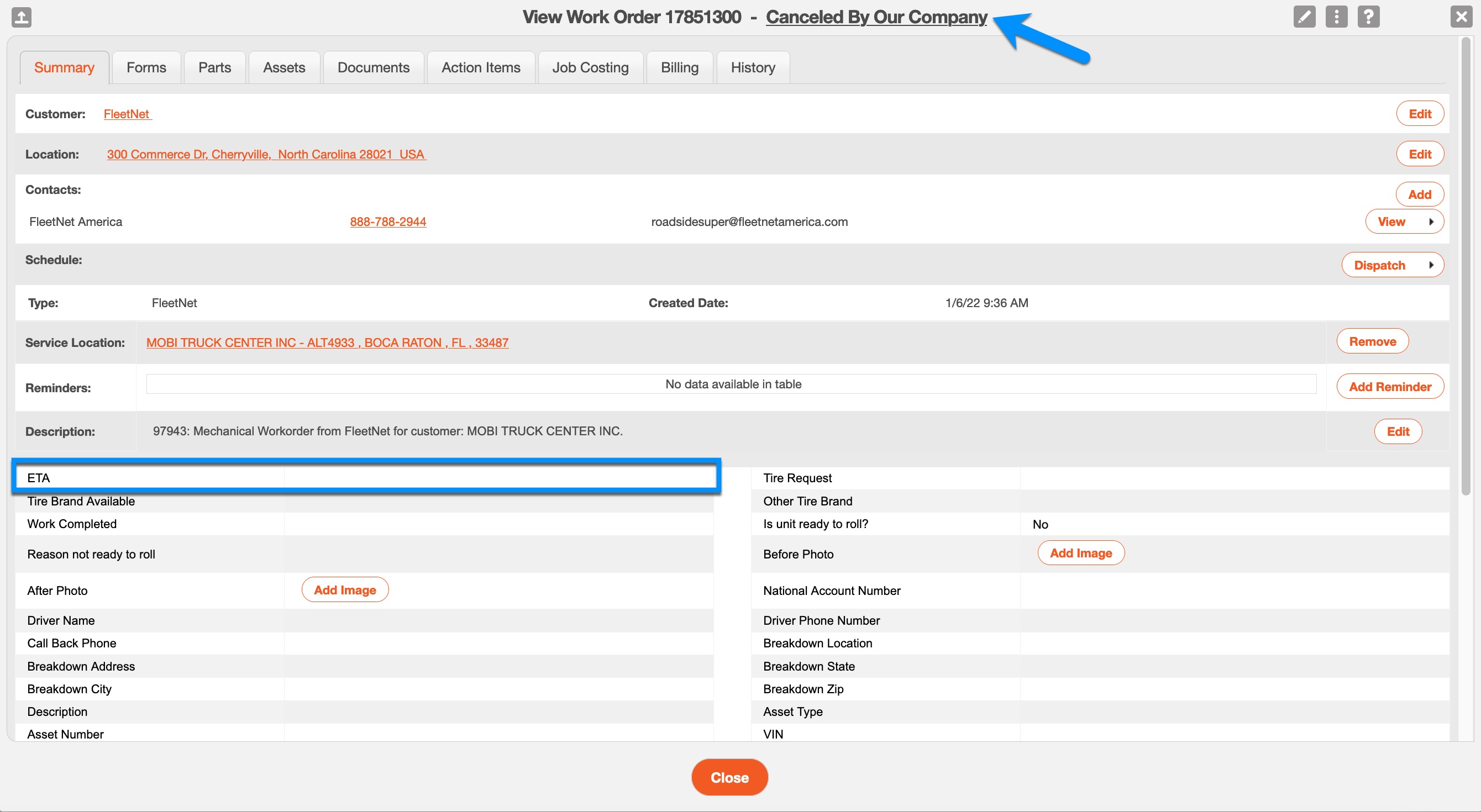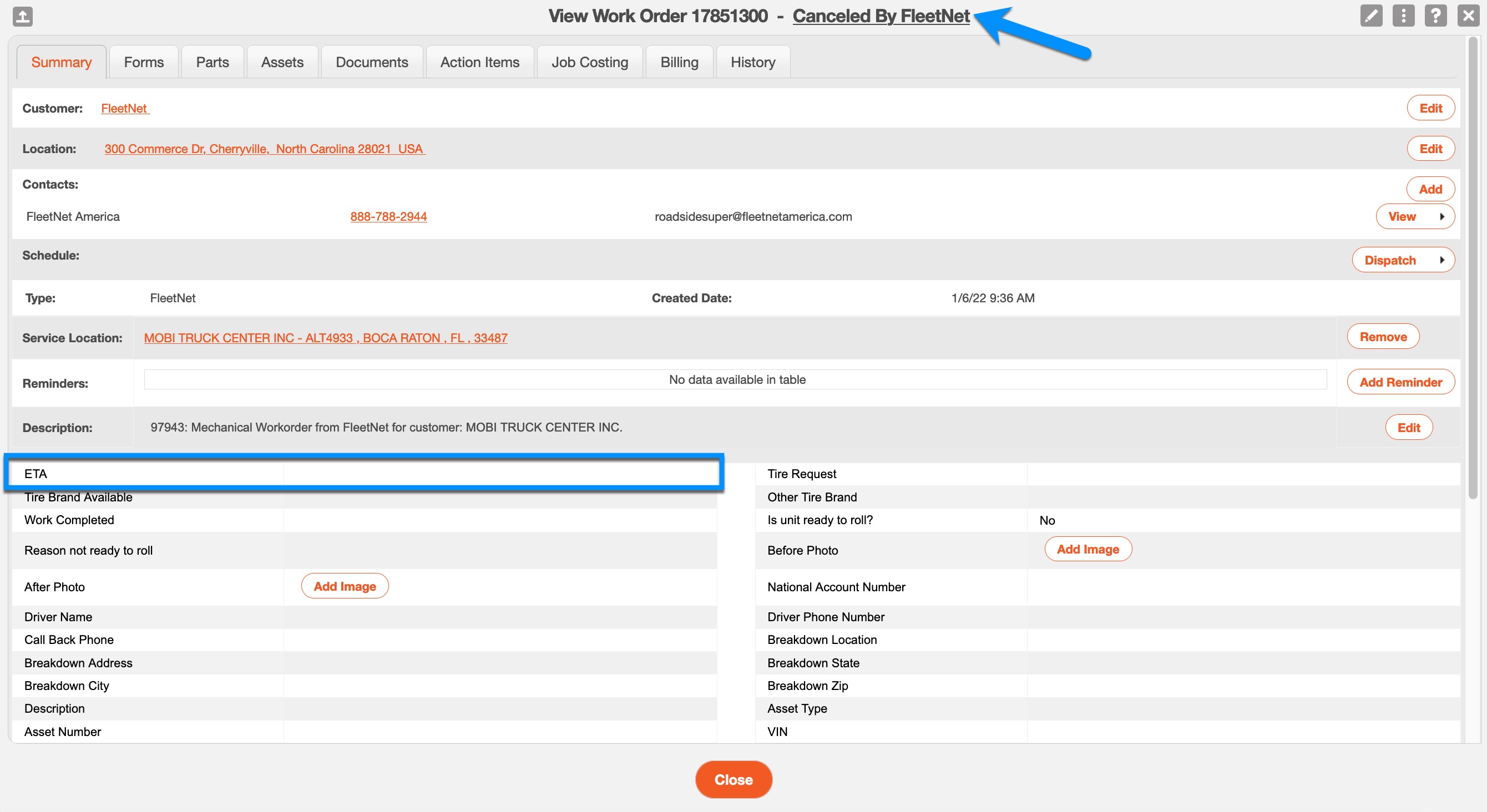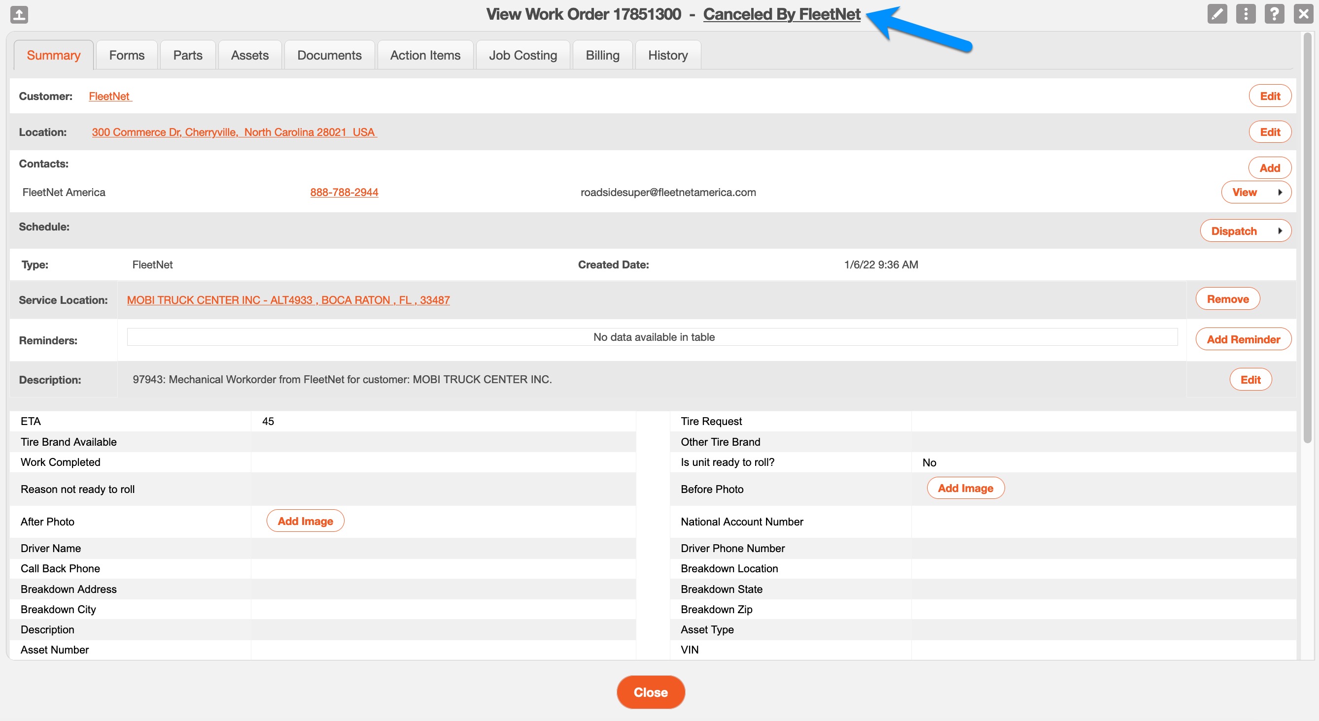 - Once the request is sent, a FleetNet work order is created with the custom status of "FleetNet Request Open".