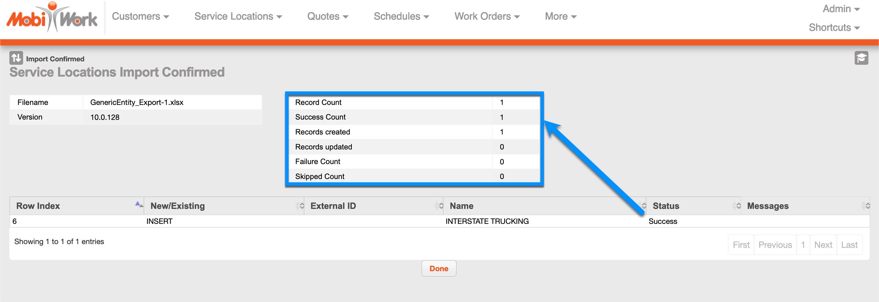 - Click Done to return to the list of Service Locations; you'll see the results of the import reflected here.