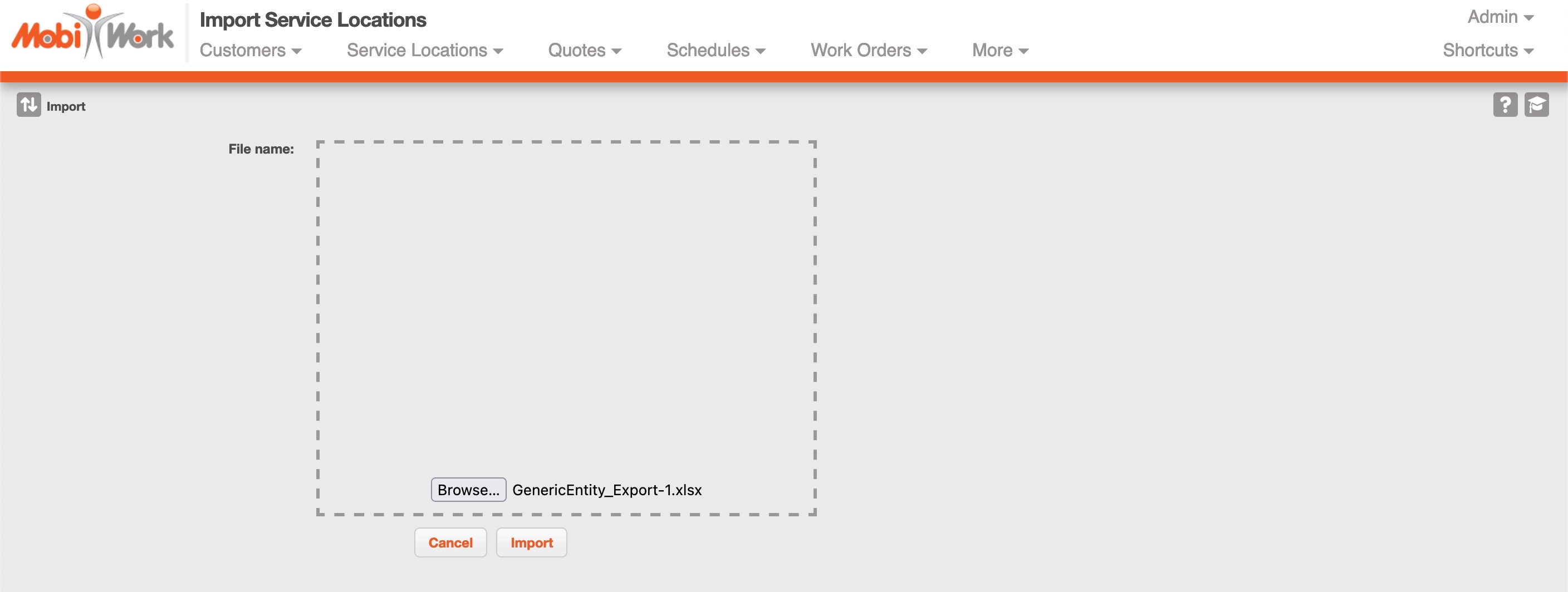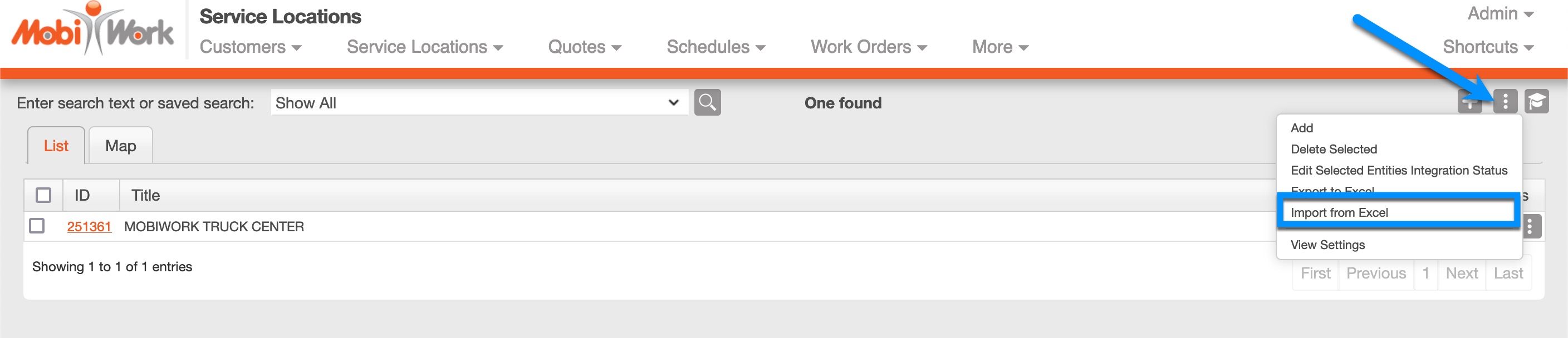 - Back in MobiWork, again choose the More Actions button, now selecting Import From Excel.