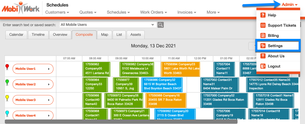 - Navigate to your MobiWork account Settings through your User drop-down, located in the top right corner.