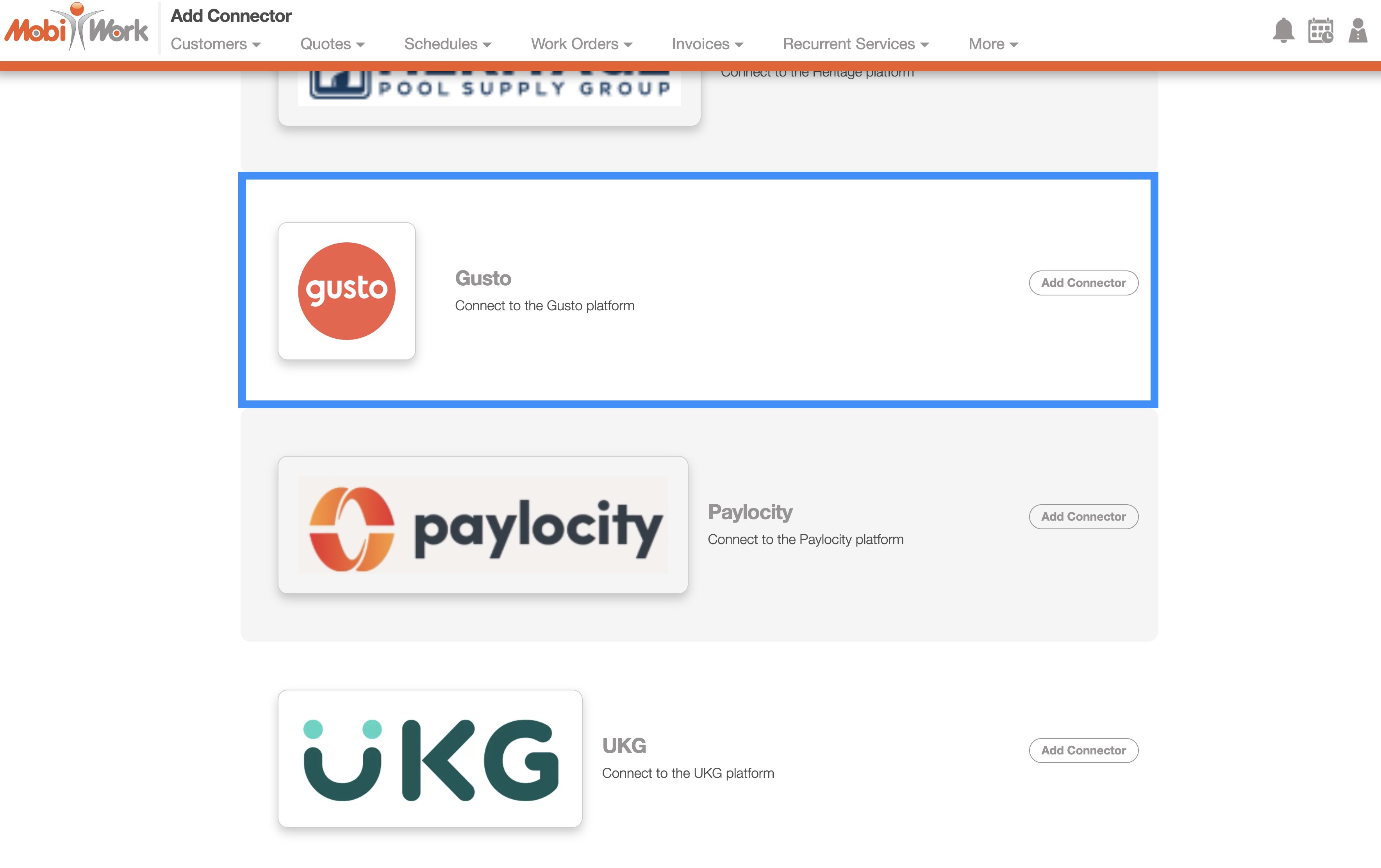 To add the Gusto connector to your MobiWork account, please follow the steps below: