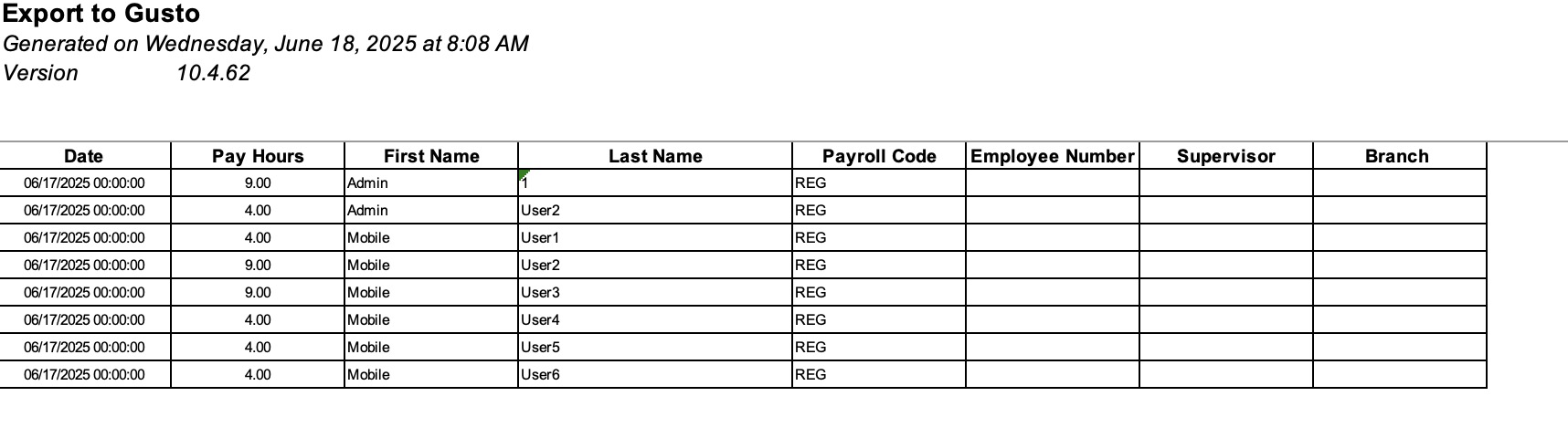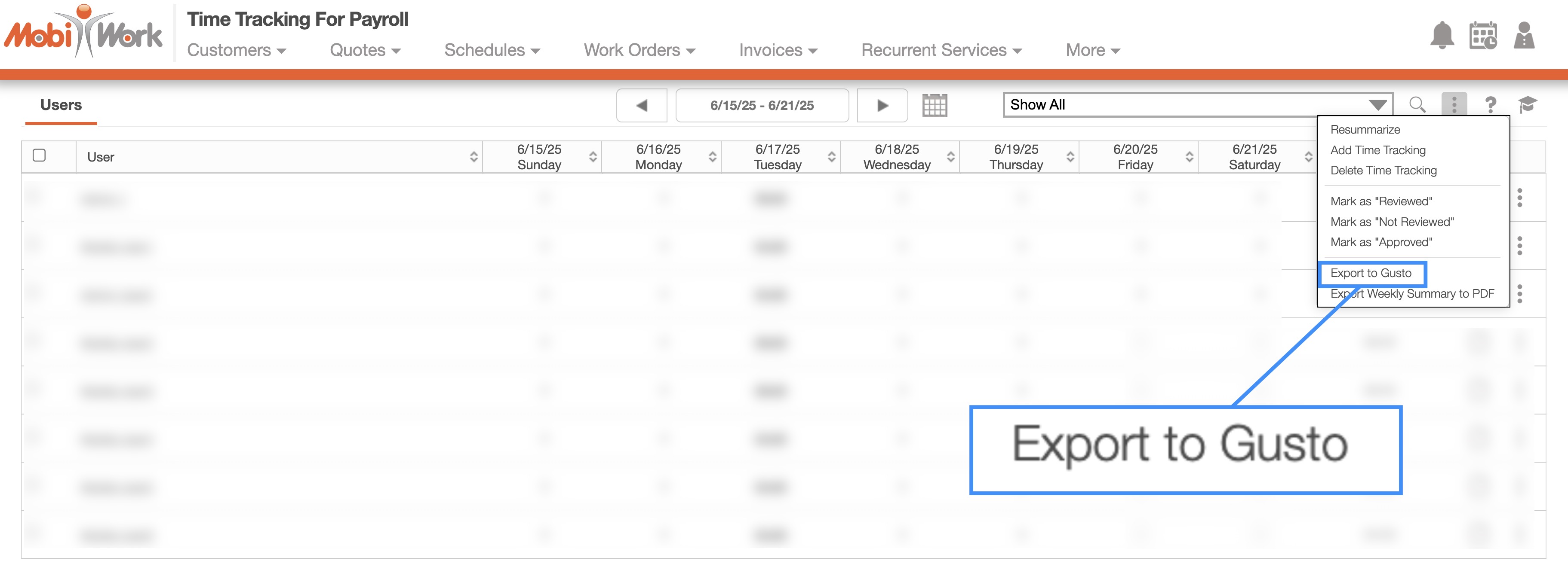 With MobiWork's integration with Gusto, you can easily export time tracking payroll data and import them directly to Gusto.