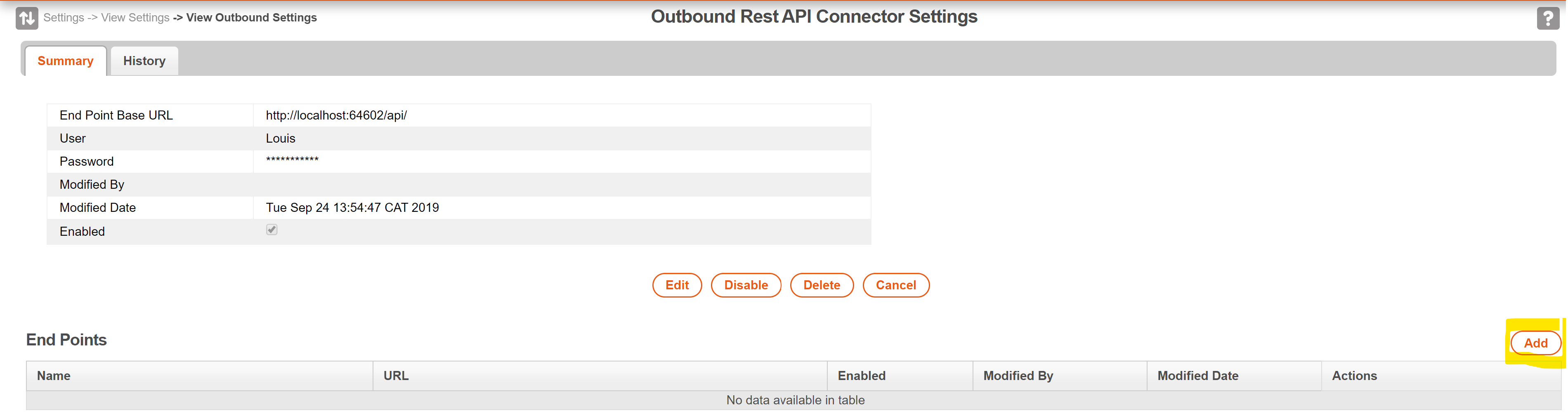 - Click on the "View" button of the MobiWork Outbound Rest API Connector