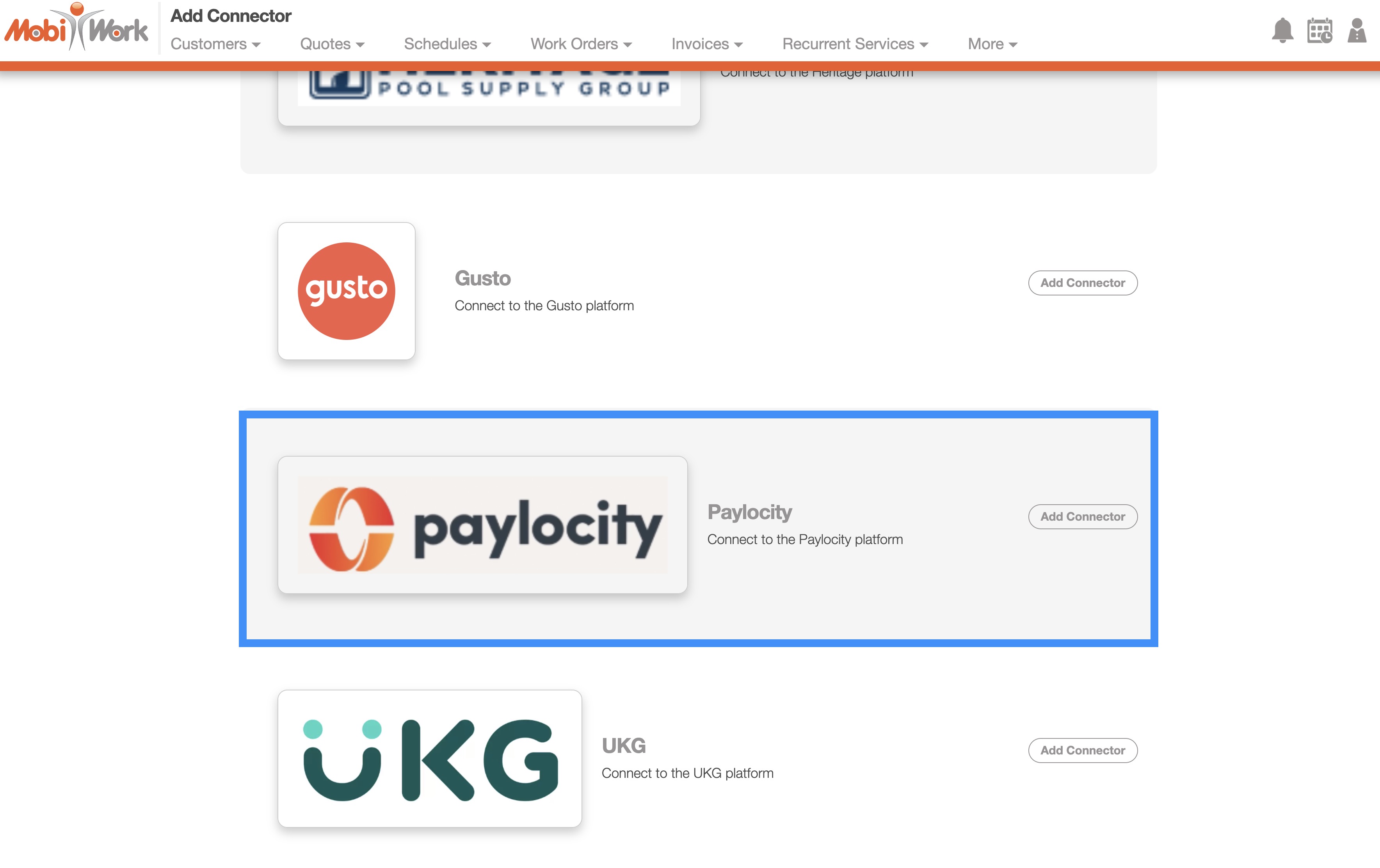 To add the Paylocity connector to your MobiWork account, please follow the steps below: