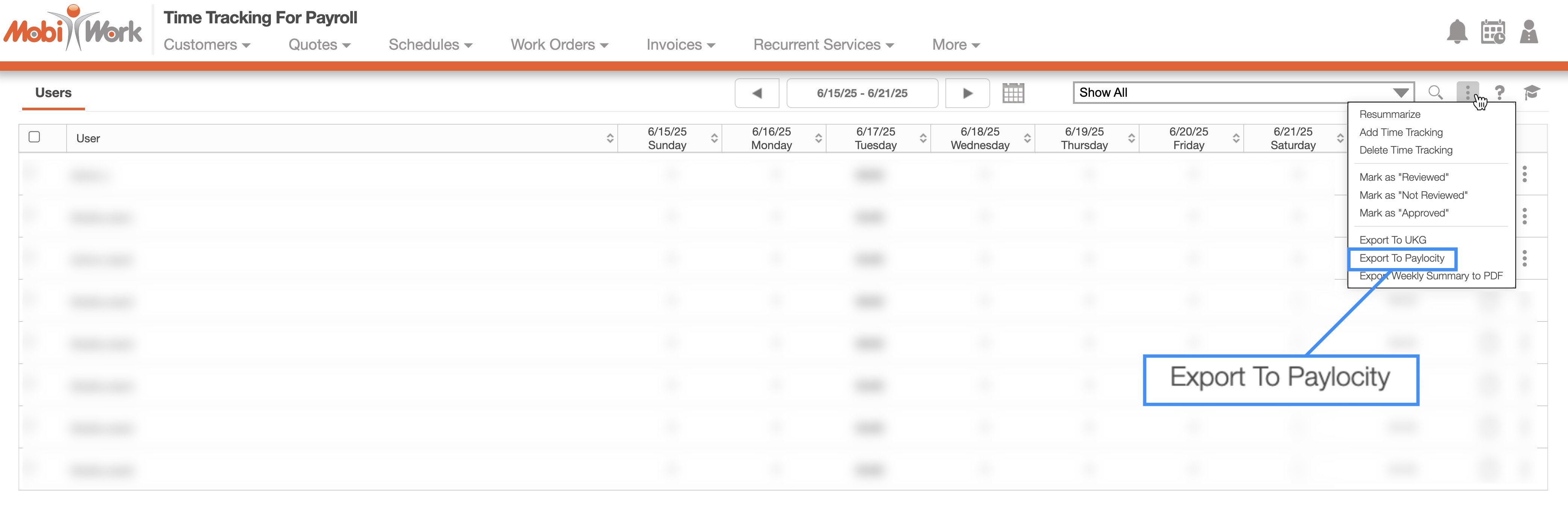 With MobiWork's integration with Paylocity, you can easily export time tracking payroll data and import them directly to Paylocity.