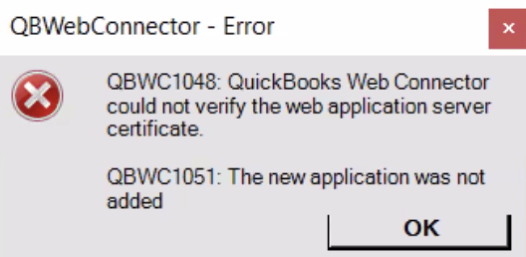 If you receive the error, "QBWC1048: QuickBooks Web Connector could not verify the web application server certificate. / QBWC: The new application was not added," this means that a third-party hosting issue is blocking the QuickBooks Web Connector certificate: