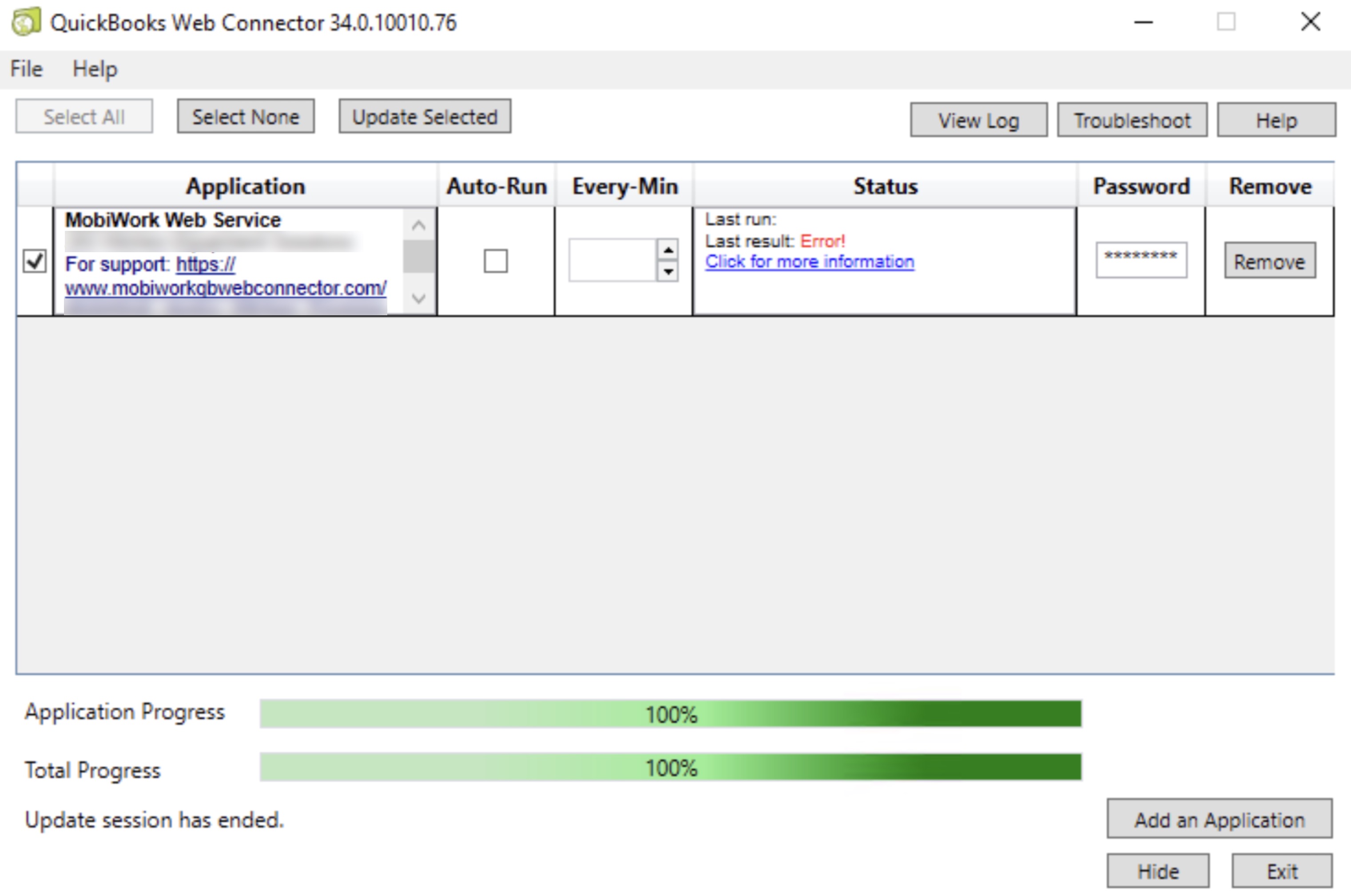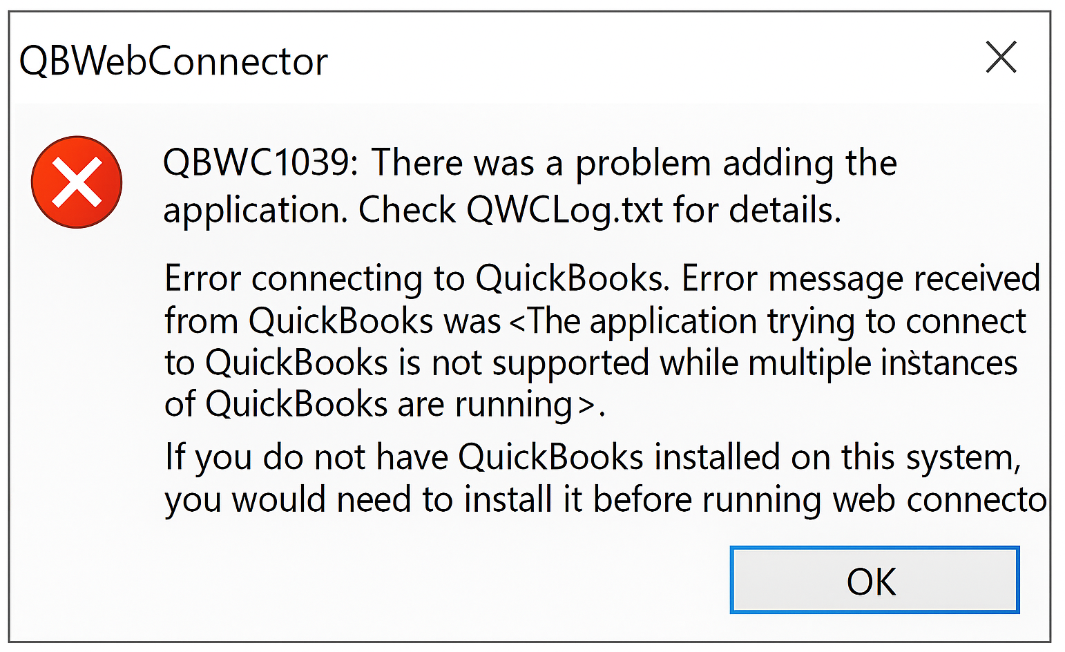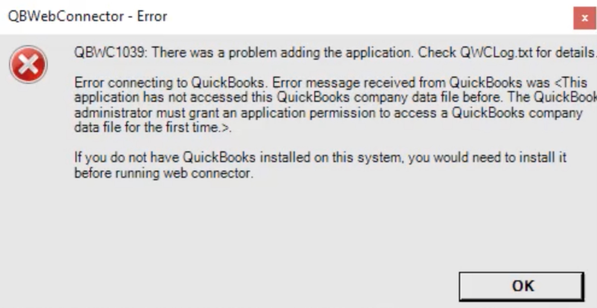 If you receive the error, "QBWC1039: There was a problem adding the application. Check QWCLog.txt for details. Error connecting to QuickBooks. Error message received from QuickBooks was