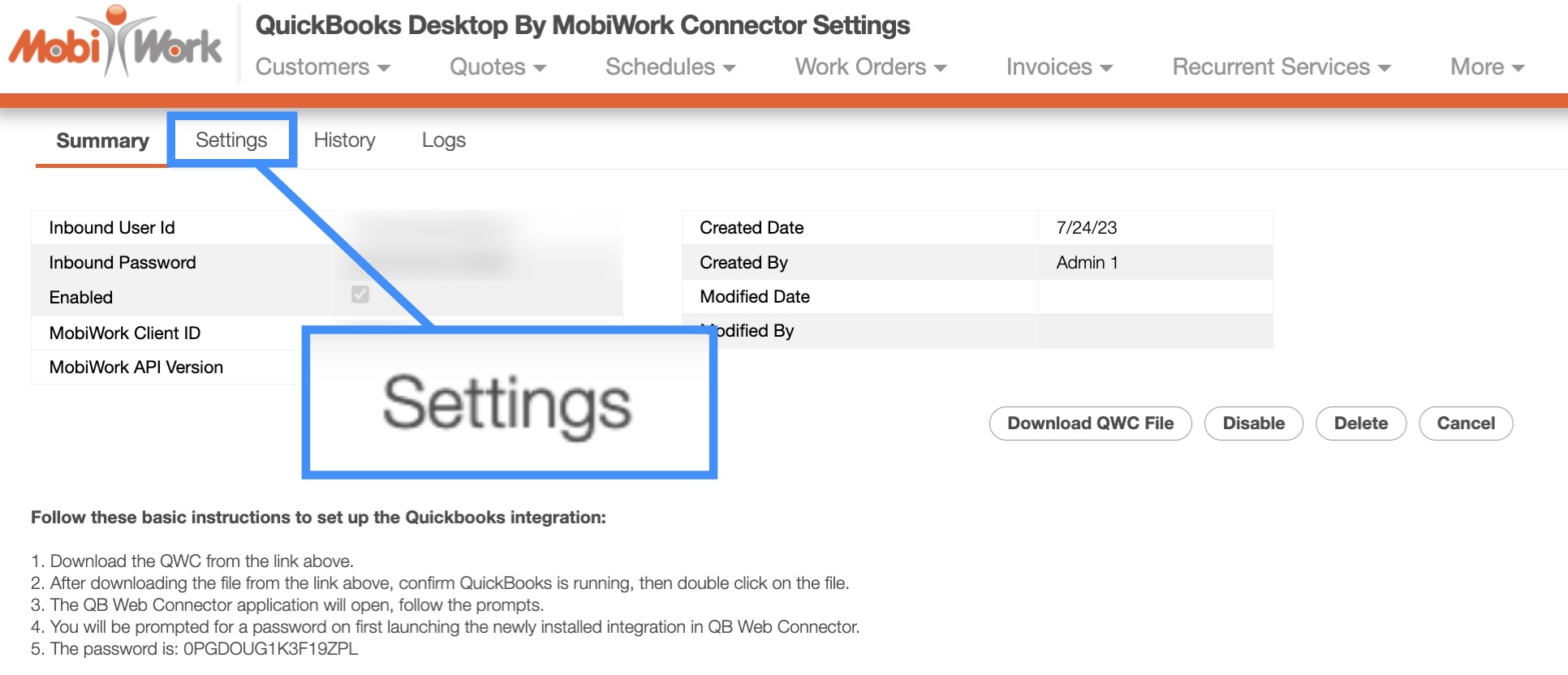 This section will highlight some of the features that can be accessed from the QuickBooks Desktop Web Connector Settings page.