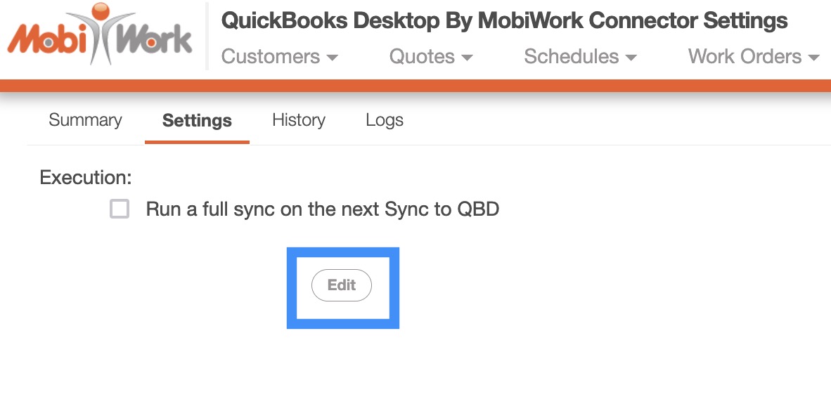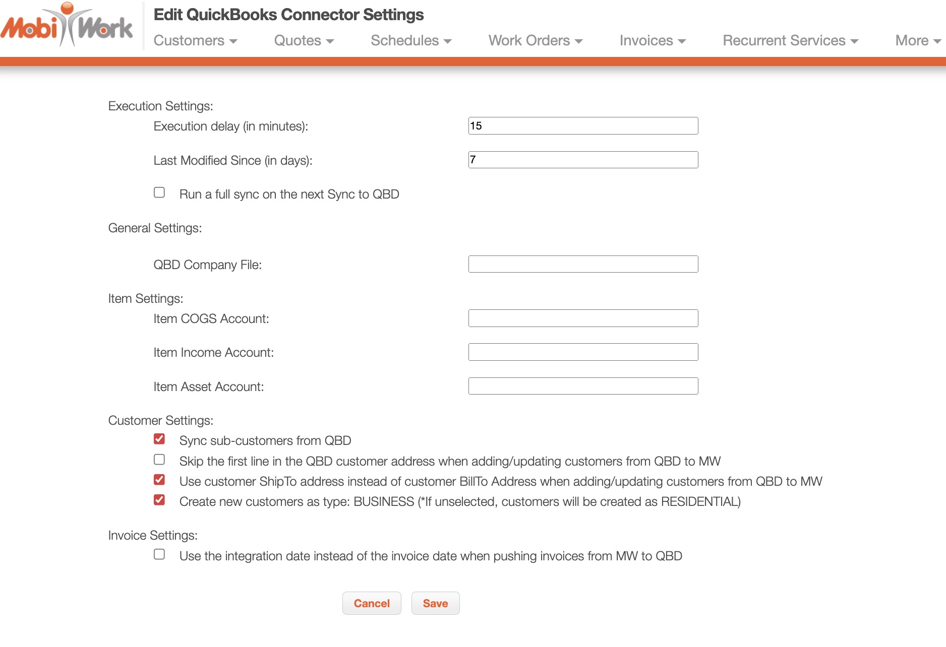 Run a full sync on the next Sync to QBD- Allows you to run a complete sync through all your MobiWork records to QBD. Once the sync is finished, this option will be unchecked; to run another full systems sync, you will need to check it again.