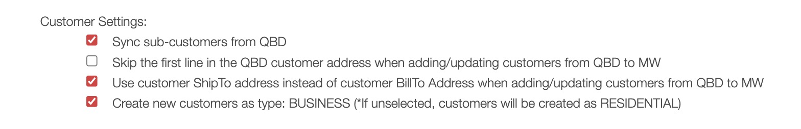 Use customer ShipTo address instead of customer BillTo Address when adding/updating customers from QBD to MW- If checked, allows you to use the ship-to address instead of the bill to address when updating or adding customers from QuickBooks Desktop to MobiWork.