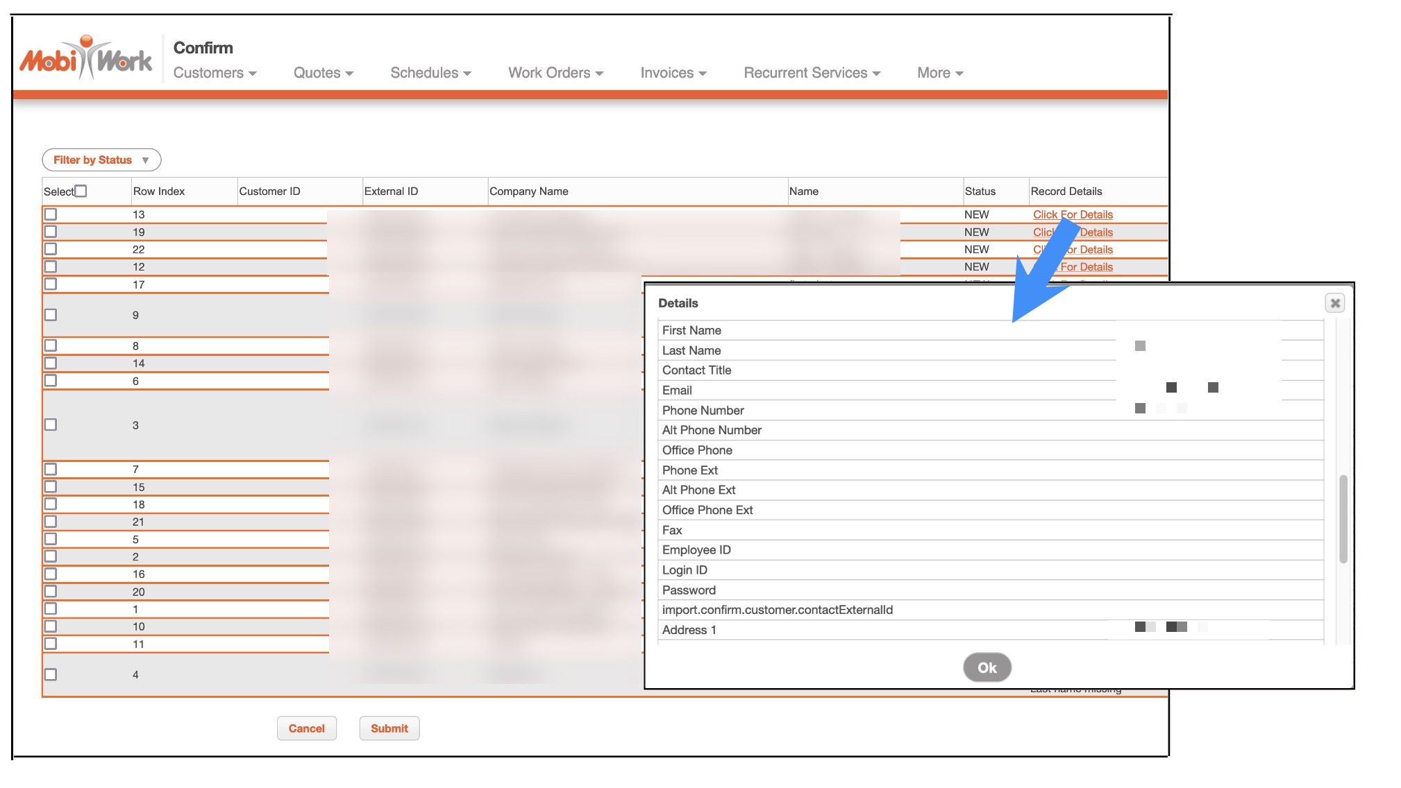 From the MobiWork Connector Settings page, select the "View" option from the Individual Actions drop-down to access a full breakdown of successful and failed records for each sync: