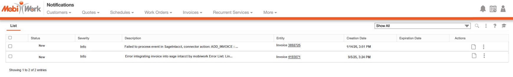 When automated invoices fail to integrate, a system notification is also created that can be seen in the notification page: