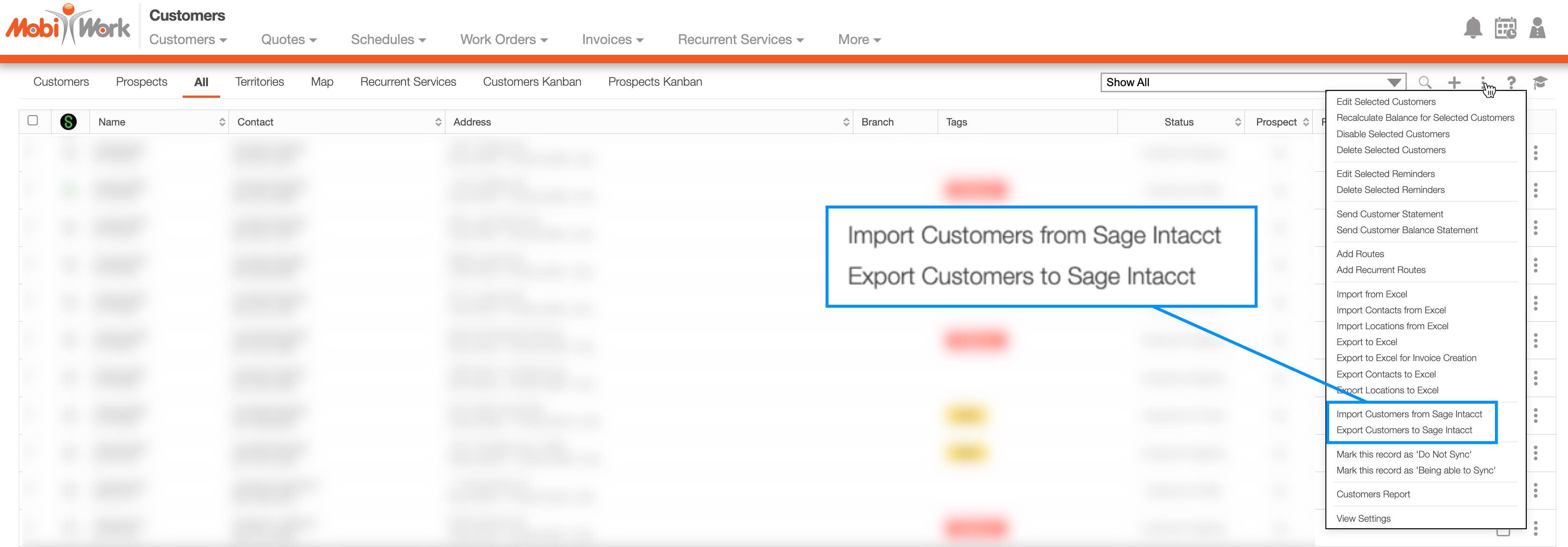 For example, on the Customers List page, you will find the Sage Intacct import and export options from the More Actions drop-down.