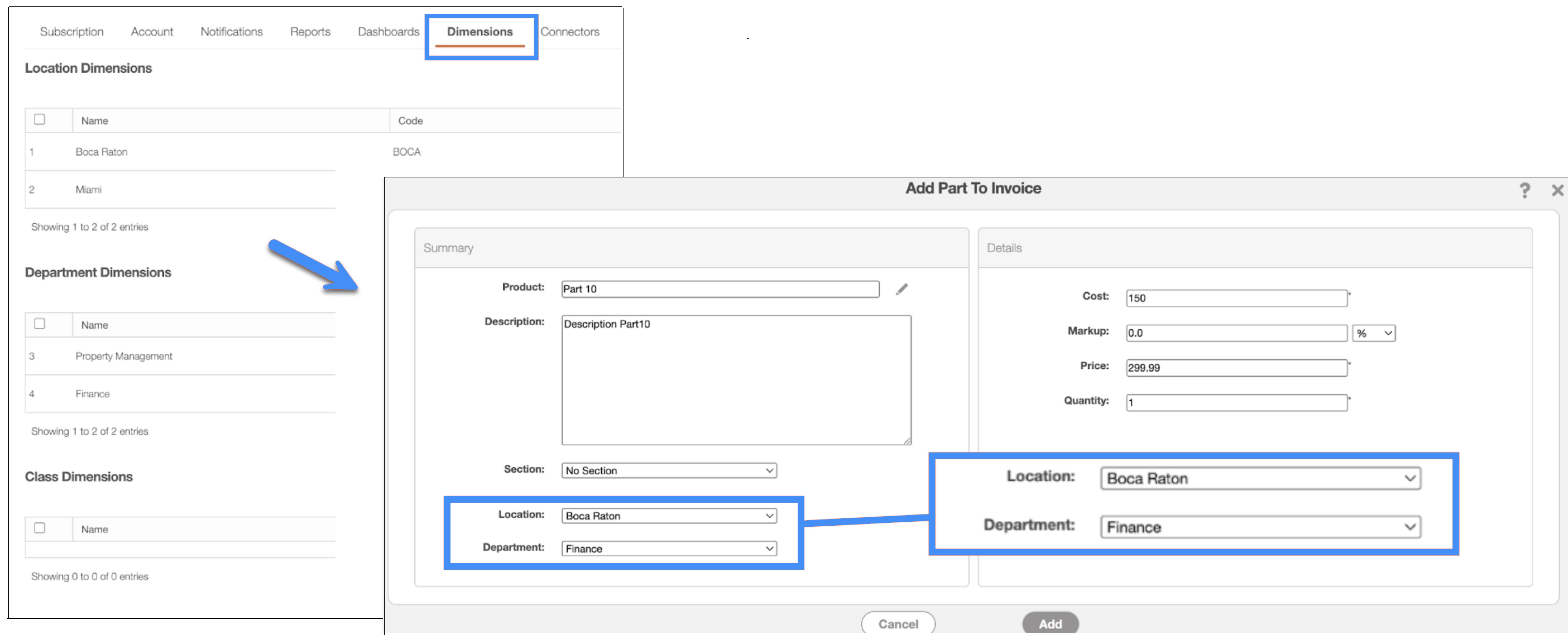 These dimensions are pulled from Sage Intacct and can be displayed on your respective entities. For example, the image below shows the Edit Customer pop-up window as well as the fields that indicate location and department: