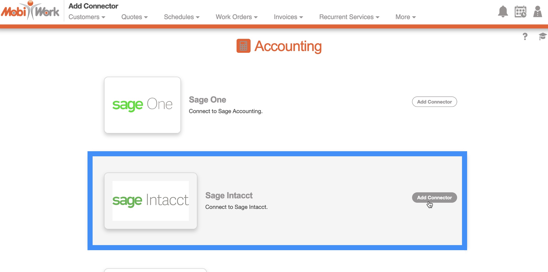 Once your Sage Intacct account is set up, you will then be able to add the Sage Intacct connector to your MobiWork account.