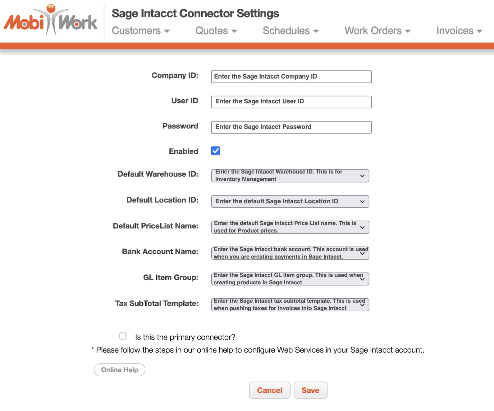 The following subsections will highlight how to install the Sage Intacct connector to your MobiWork account.