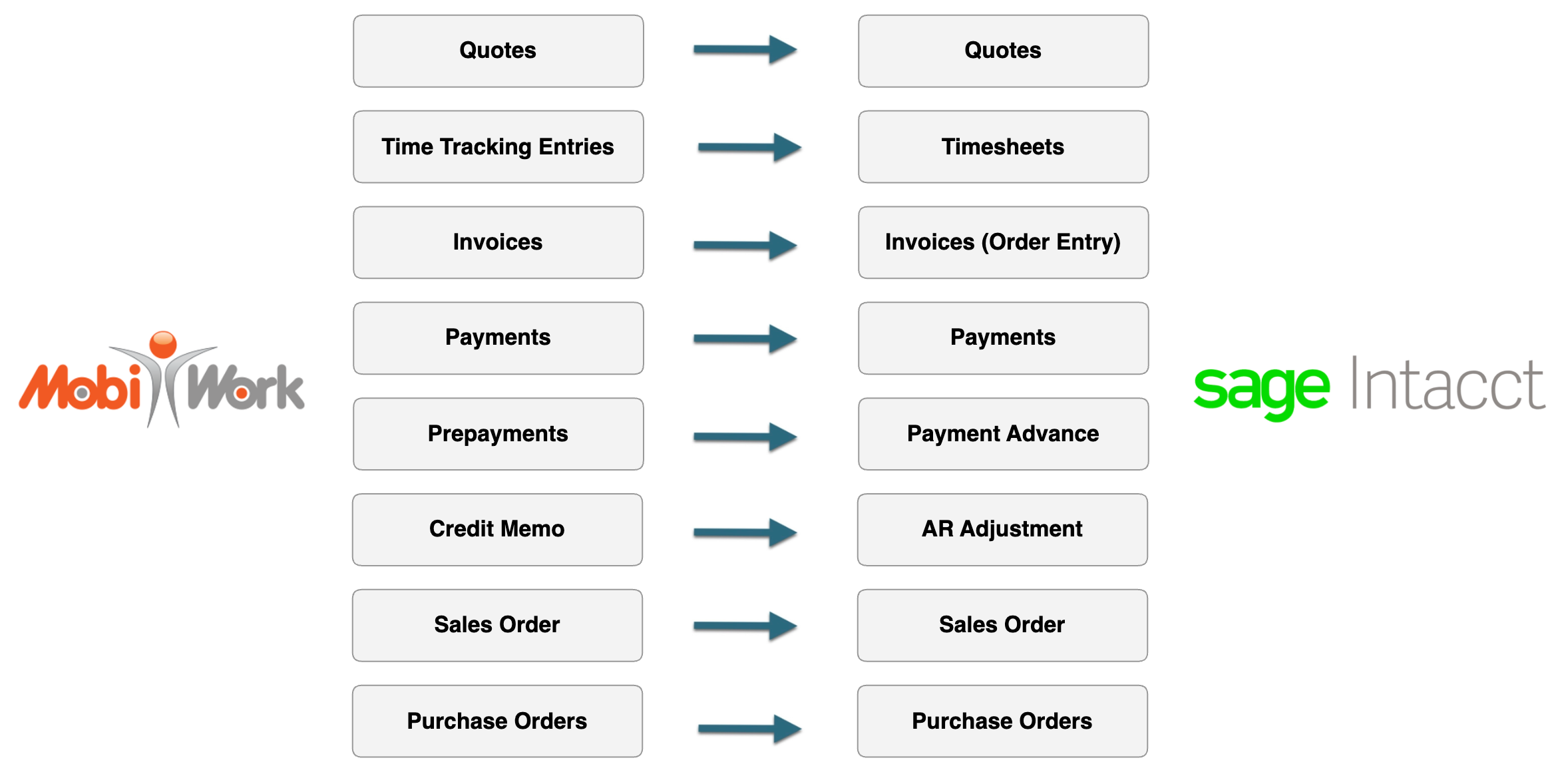 The following outlines what transaction data is synchronized between MobiWork and Sage Intacct: