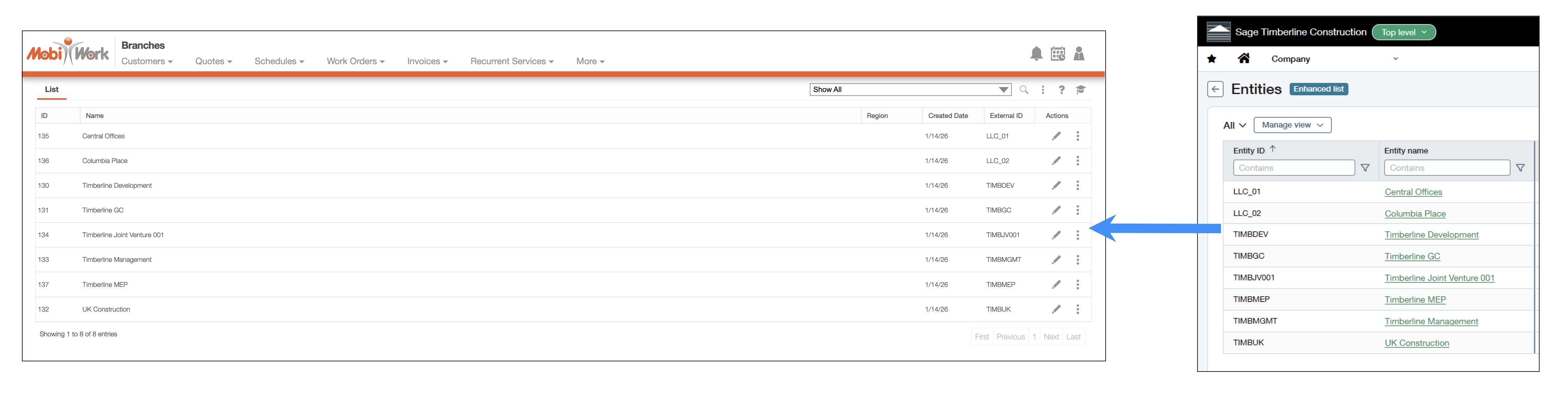 Sage Intacct uses entities to represent different business units, regions, or subsidiaries (for example, East Coast, West Coast, or ABC Construction LLC) which makes it very easy to organize, scale, and grow your business (e.g., add-on acquisitions). In MobiWork we refer to these entities as branches. If you have branches set up in MobiWork, these branches can also be used to organize operations, users, and transactions by location or business unit.