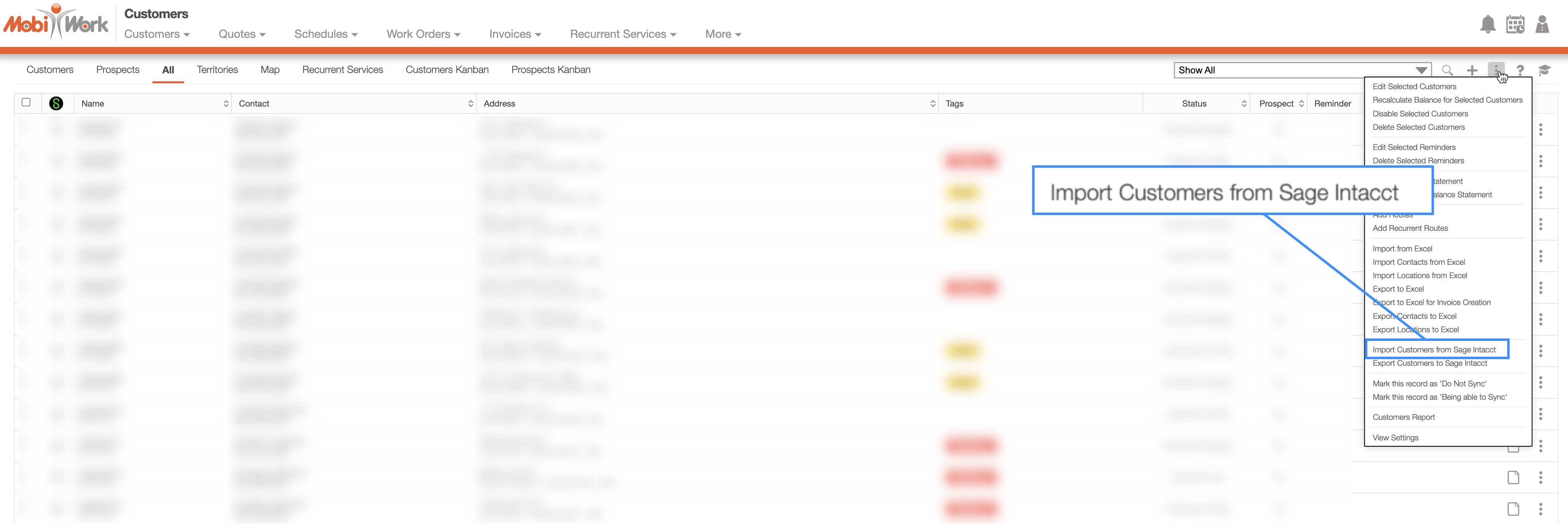 To manually sync data from Sage Intacct into MobiWork, use the Import options found in the More Actions drop-down. For example, select "Import Customers from Sage Intacct" option from the Customers List page: