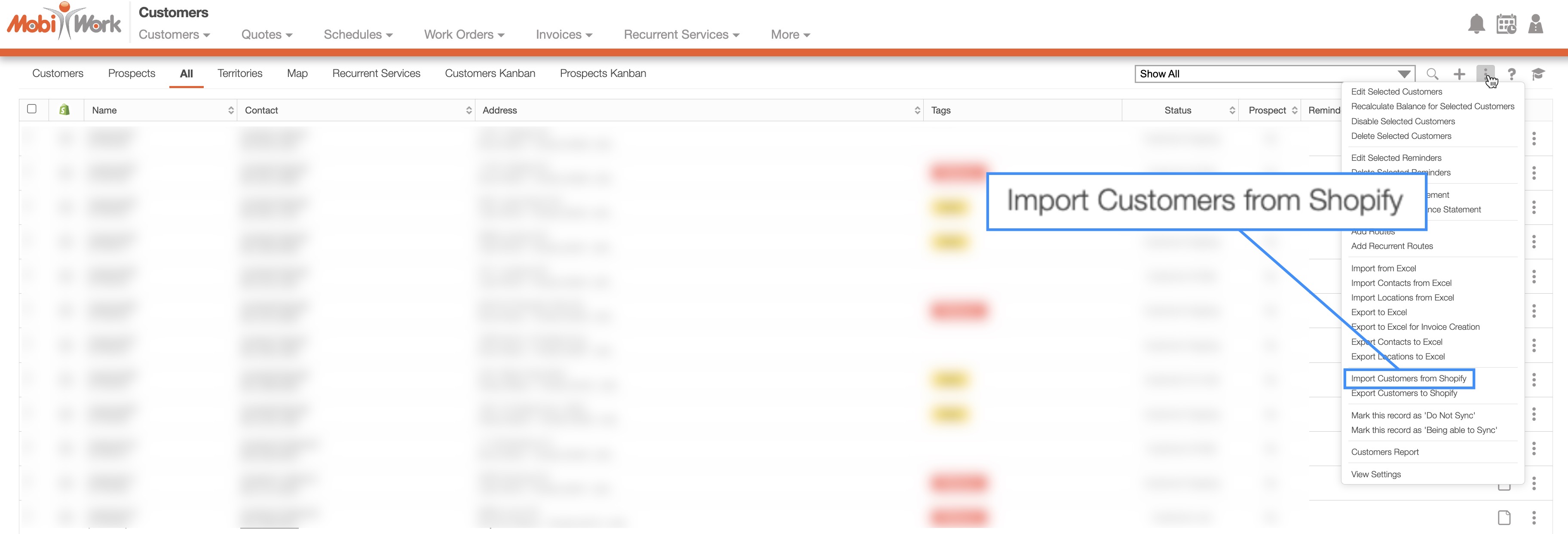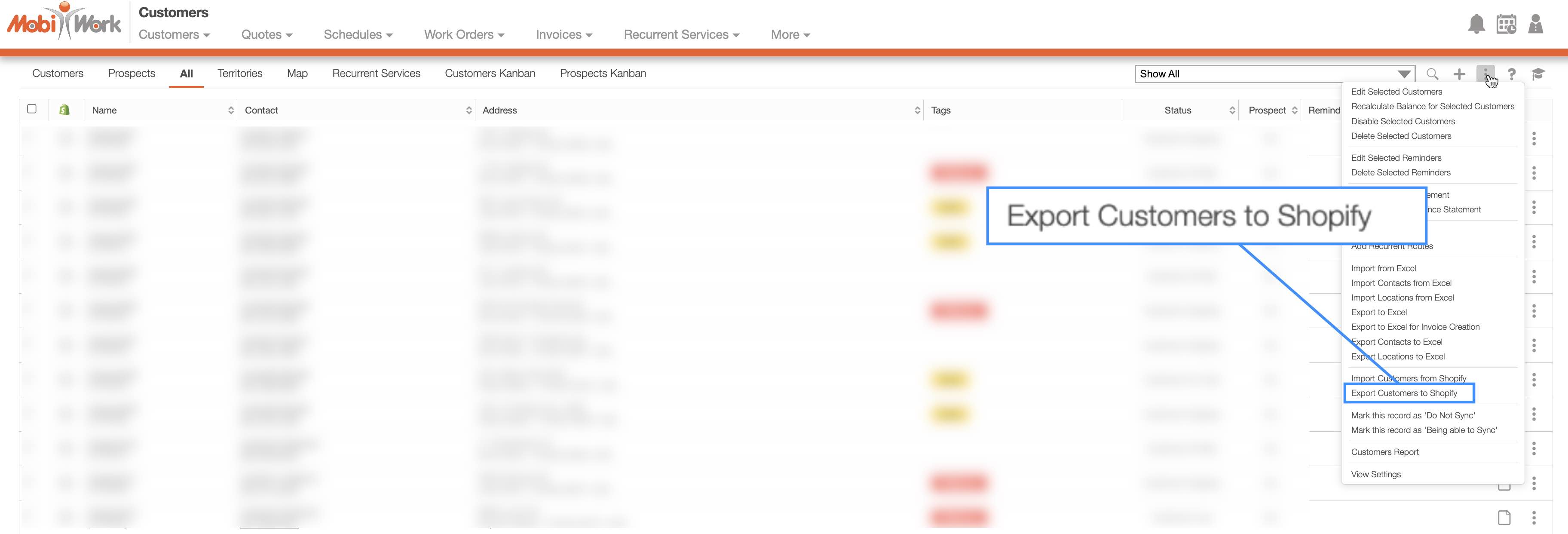 The example below shows the Customers List page; however, you can access the export action from the customers, invoices, inventory, and parts List pages. By selecting the export action from the More Actions drop-down, you will be able to sync the selected entities from your MobiWork account to your Shopify account: