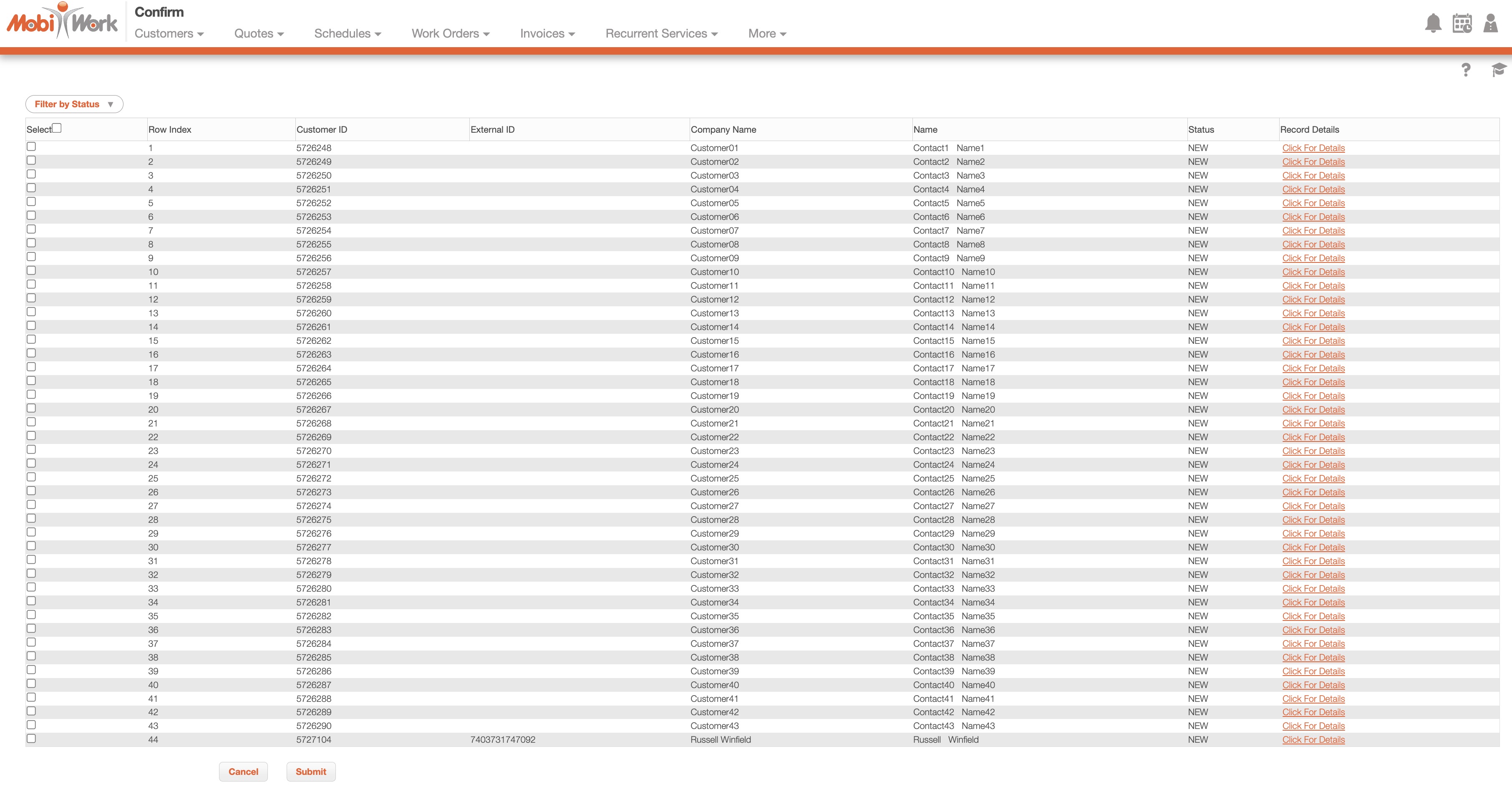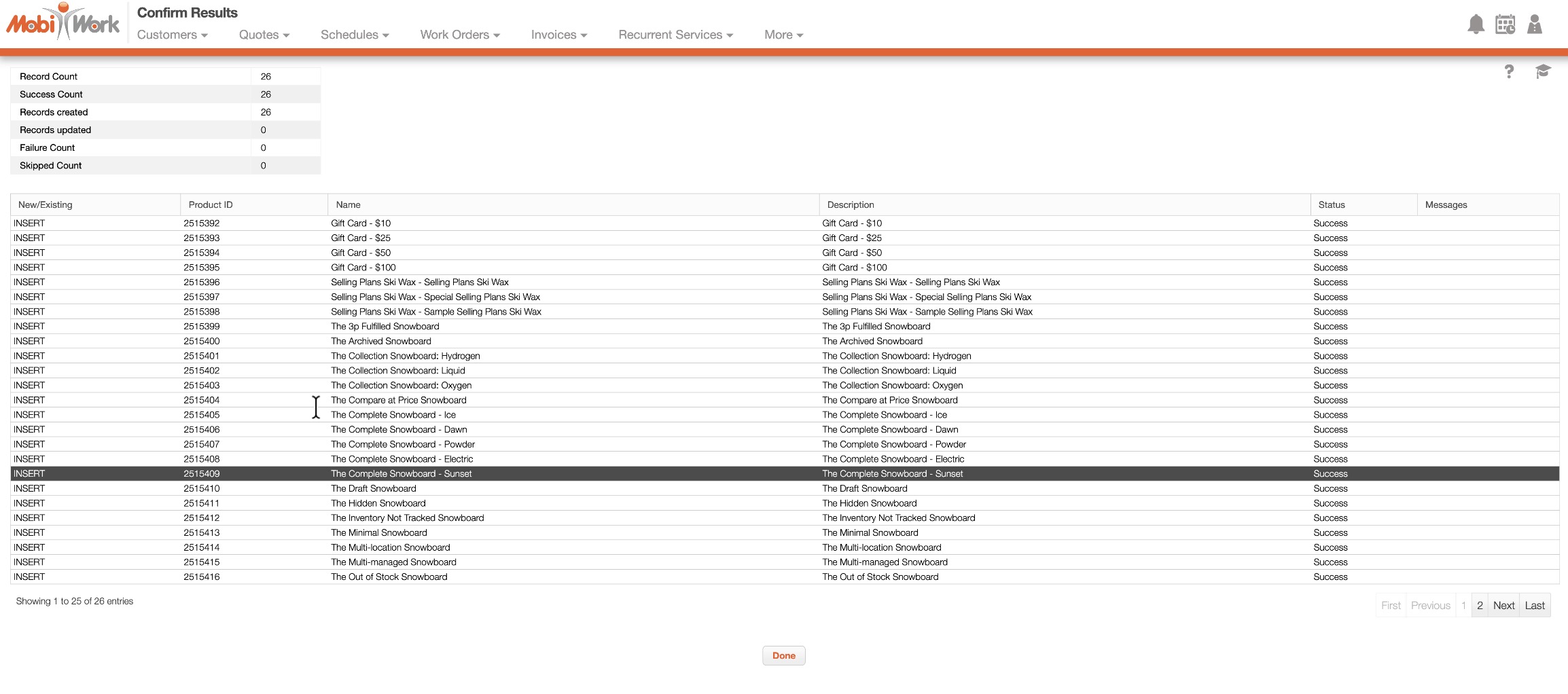 The Confirm Results page will then list the outcome of the synchronization process. The imported customers, parts, warehouses, and inventory will then be displayed in your MobiWork account: