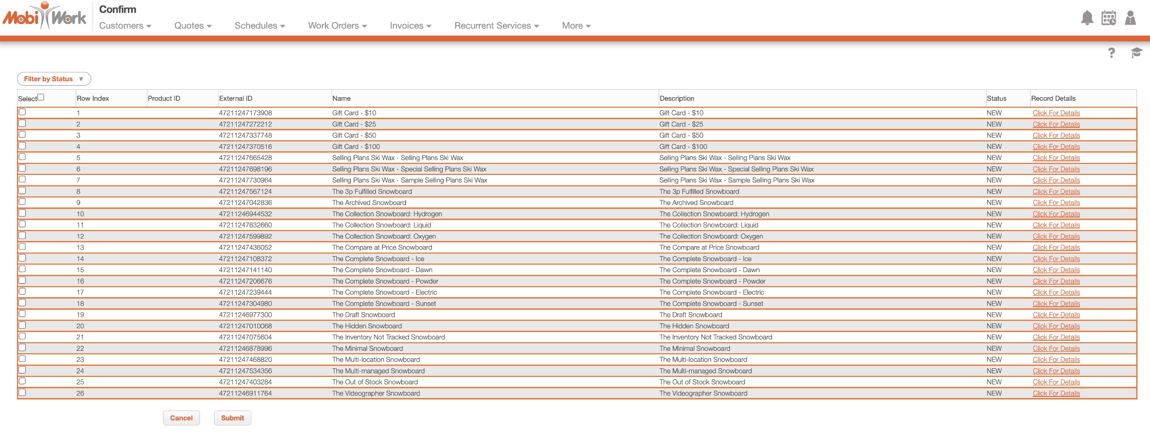 Select the desired entities you would like to import from Shopify to MobiWork. Once selected, click the Submit button to confirm you would like to import the chosen entities: