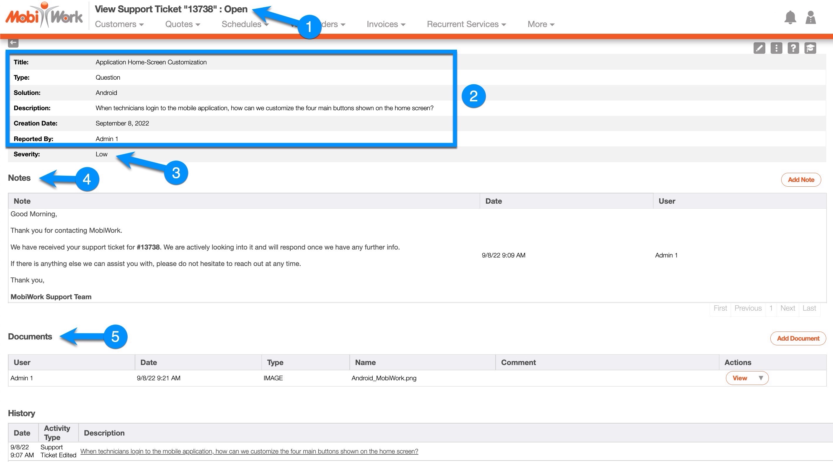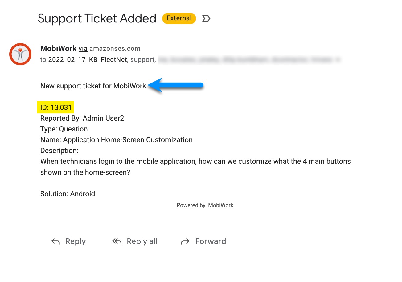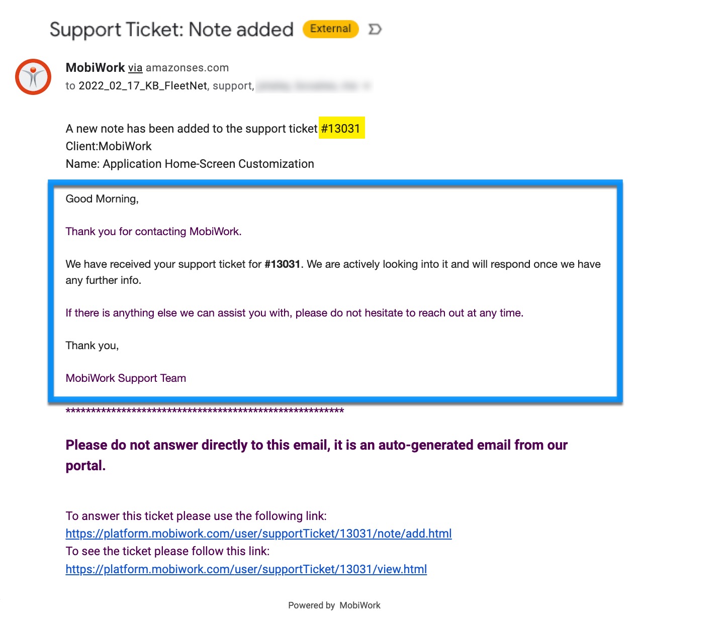 - The customer will receive an email with the subject Support Ticket Added along with all the other Global Admins listed on the MobiWork account.