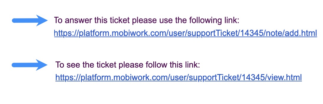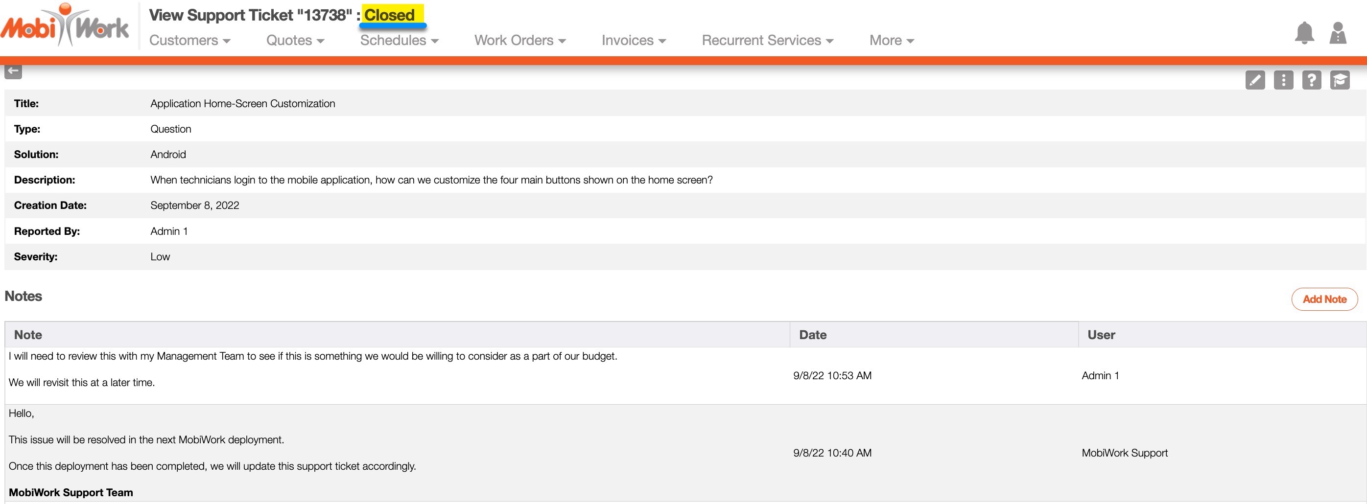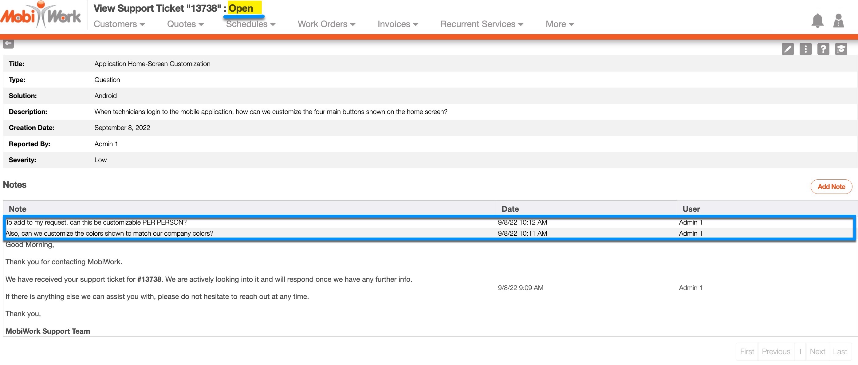 - The customer will receive an email with the subject Support Ticket Added along with all the other Global Admins listed on the MobiWork account.