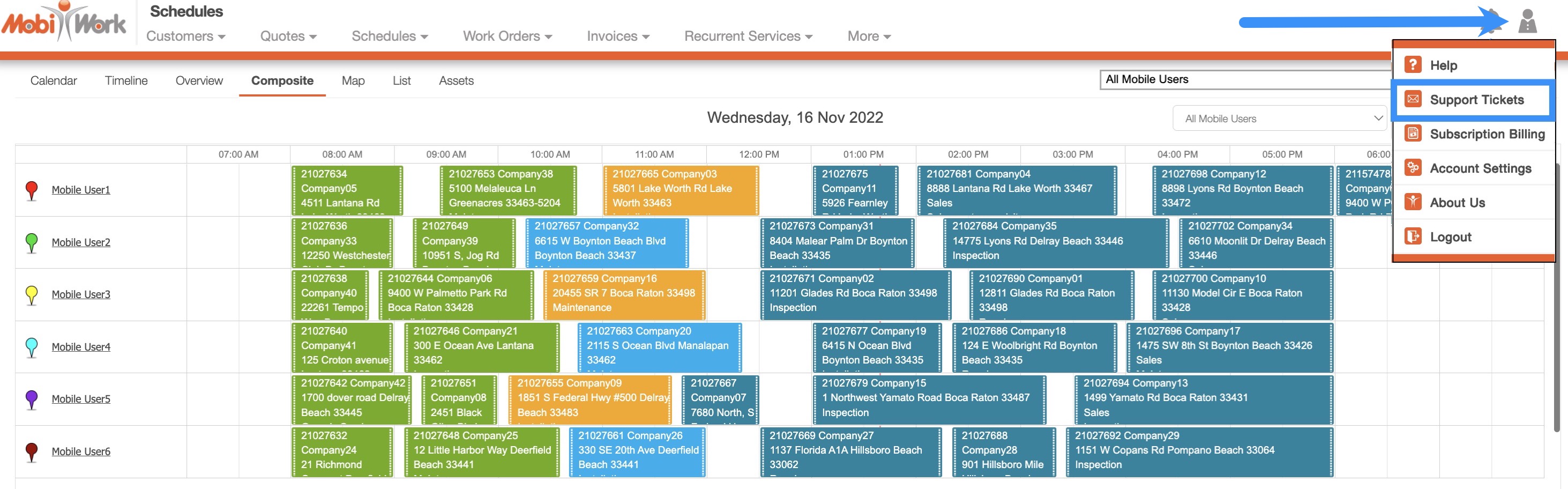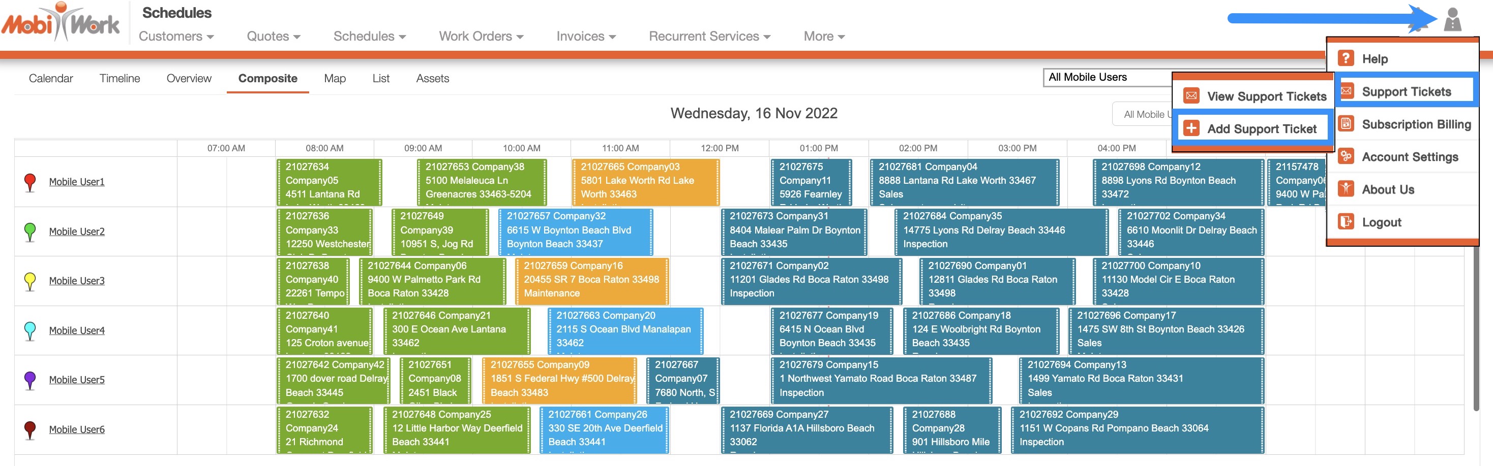 Support Tickets are the preferred way to communicate with the MobiWork Success and Support team; they provide a guaranteed response time within our support window. Support Tickets are available within the Help menu in your MobiWork web app and allow us to efficiently provide service to you and your company.