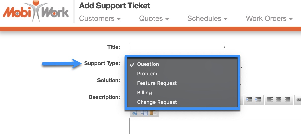 - Support Type: Let us know what type of support you are in need of: Question, Problem, Feature Request, Billing or Change Request.