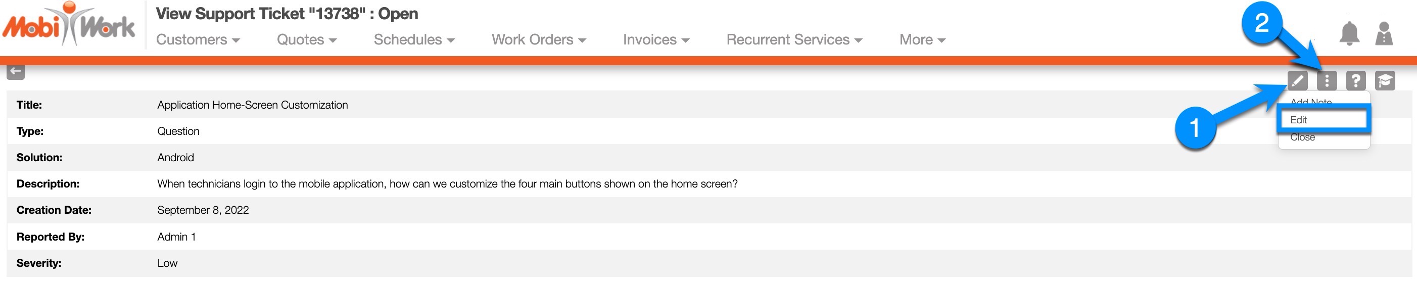 - To edit any of the Support Ticket Details, simply (1) choose the Edit (pencil) button or (2) choose More Actions and select Edit.