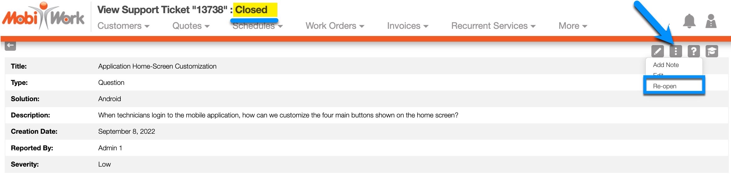 - If your ticket is ever in the Closed status, but needs to be re-opened, the More Actions drop-down button will show the Re-open option (but only in the Closed status).