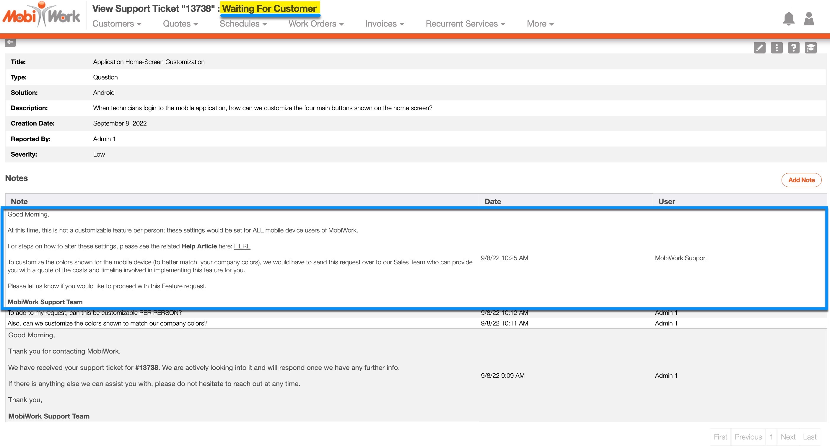 - If for any reason the Support Team needs more information from the customer, they will add a new note to the ticket, while marking it in the "Waiting for Customer" status.