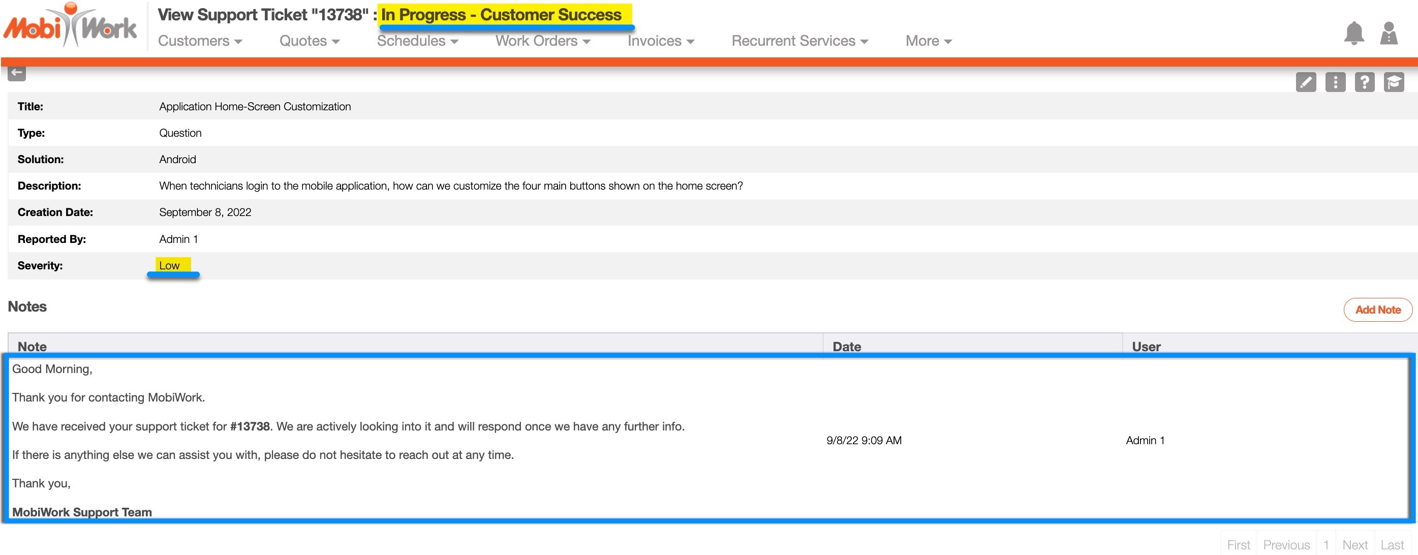 - Once the Support Team has seen the ticket, they will acknowledge it with a response, moving it into the "In Progress" status; With this, they will set the ticket severity based on the guidelines outlined in Support Ticket Severity.