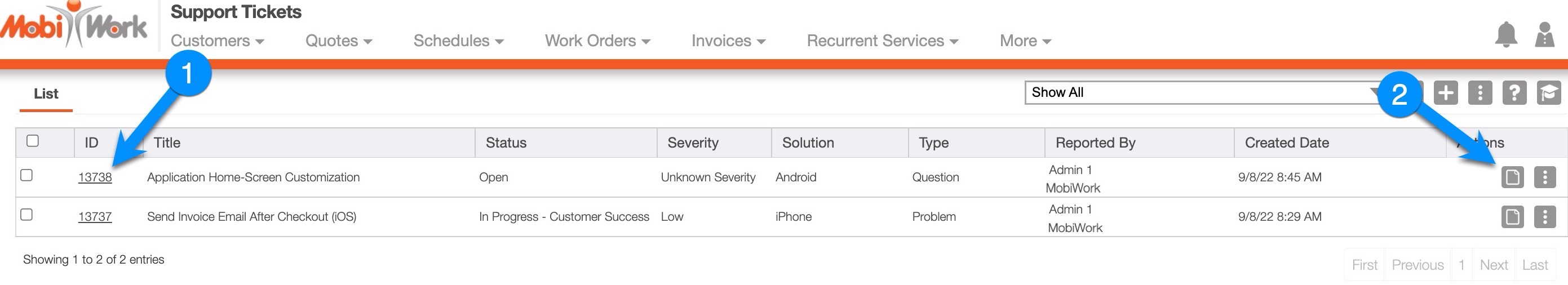 - Choose the View button in the Actions column to view the ticket; or you can click on the ID that is a direct hyperlink to the ticket details.