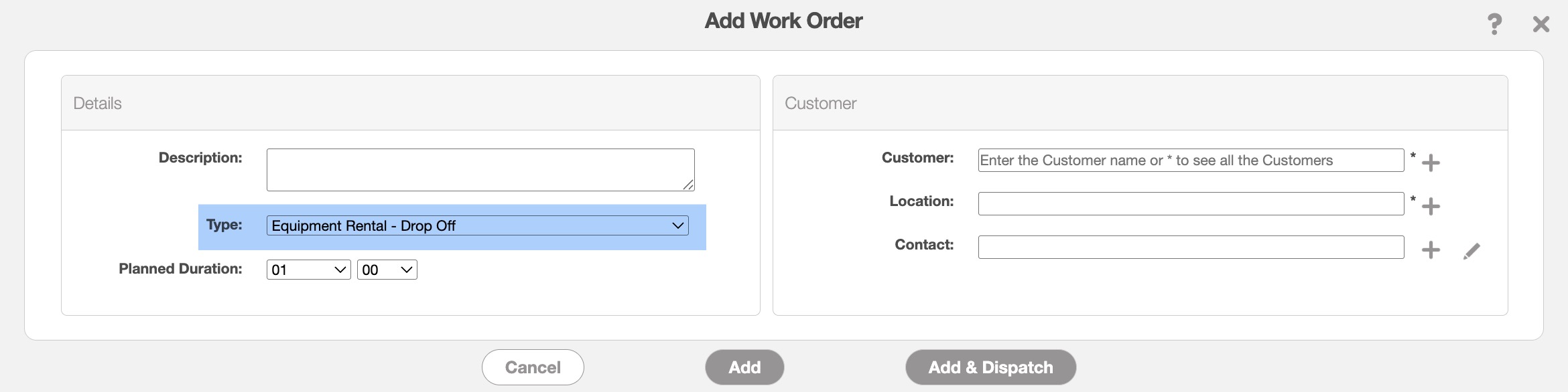 When creating a new work order for asset rentals, simply select the "Equipment Rental - Drop Off" option in the "Type" field: